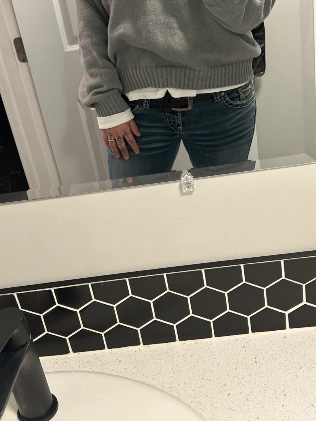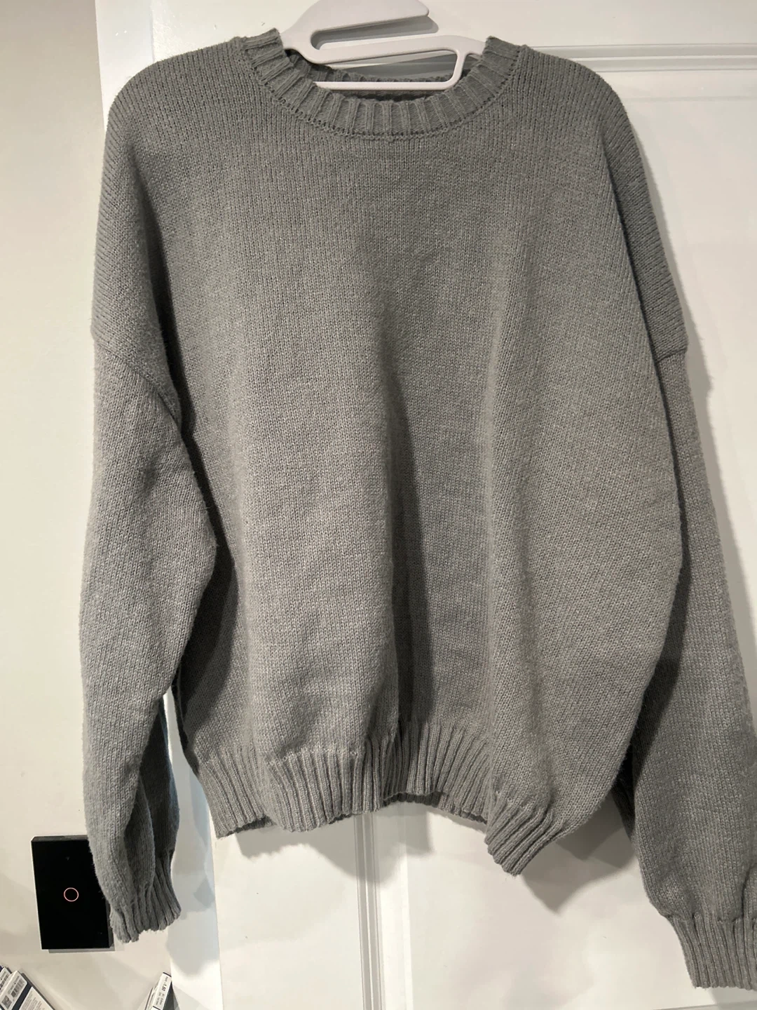 Selling a cozy grey knit sweater. It's a great layering piece for the cooler weather! The material feels soft and comfortable, perfect for everyday wear. Only worn once. For reference I am 5’9 and about 180pnds. That is me in the photos.