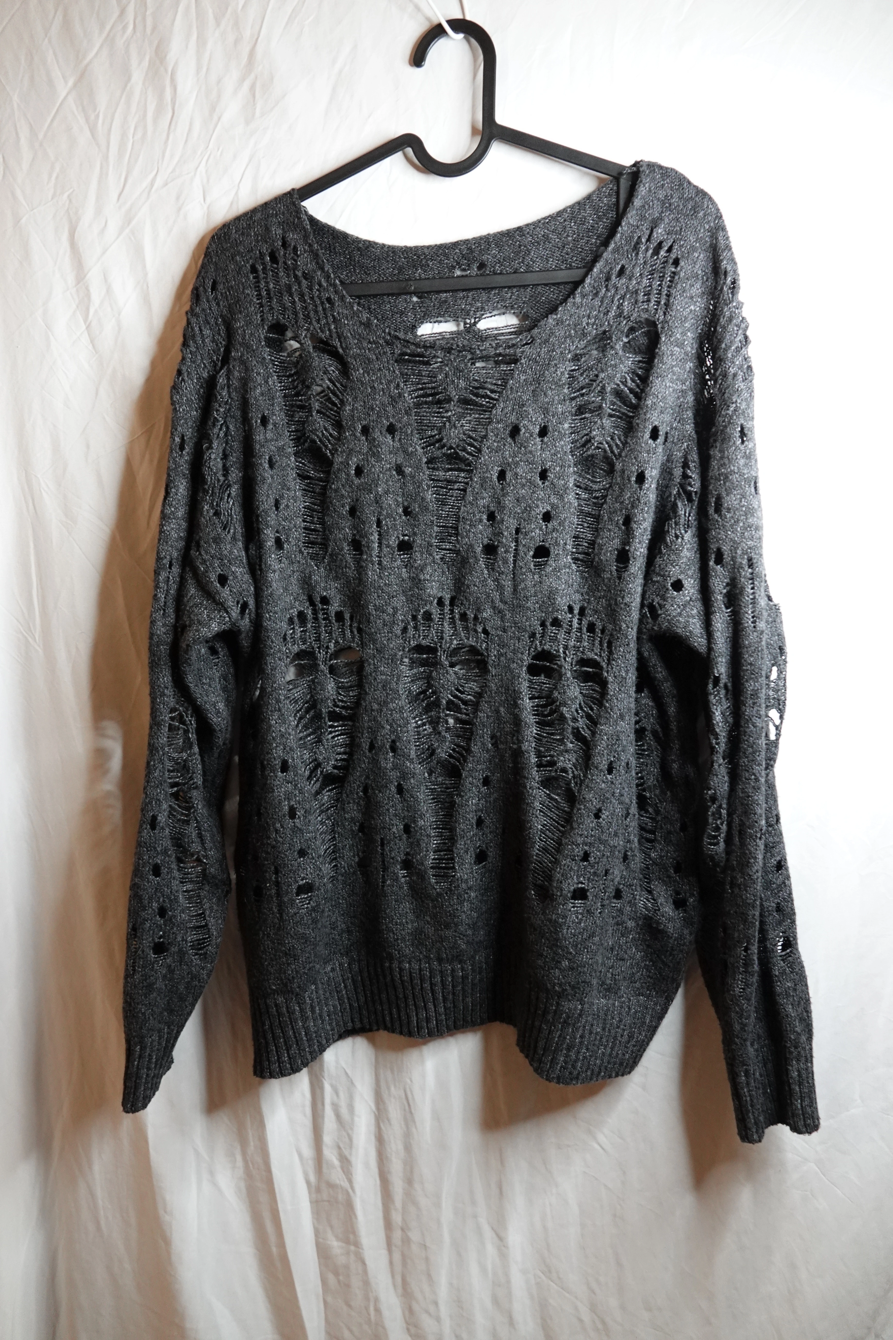 Manfinity brand distressed knit sweater, size M, in dark charcoal gray. Features intentionally destroyed, open-knit pattern for an edgy, grunge/alternative look. Ribbed hem and cuffs, soft stretch material, oversized slouchy fit. All holes and tears are part of the original design. Condition: Gently used, clean, no extra wear beyond factory distressing.