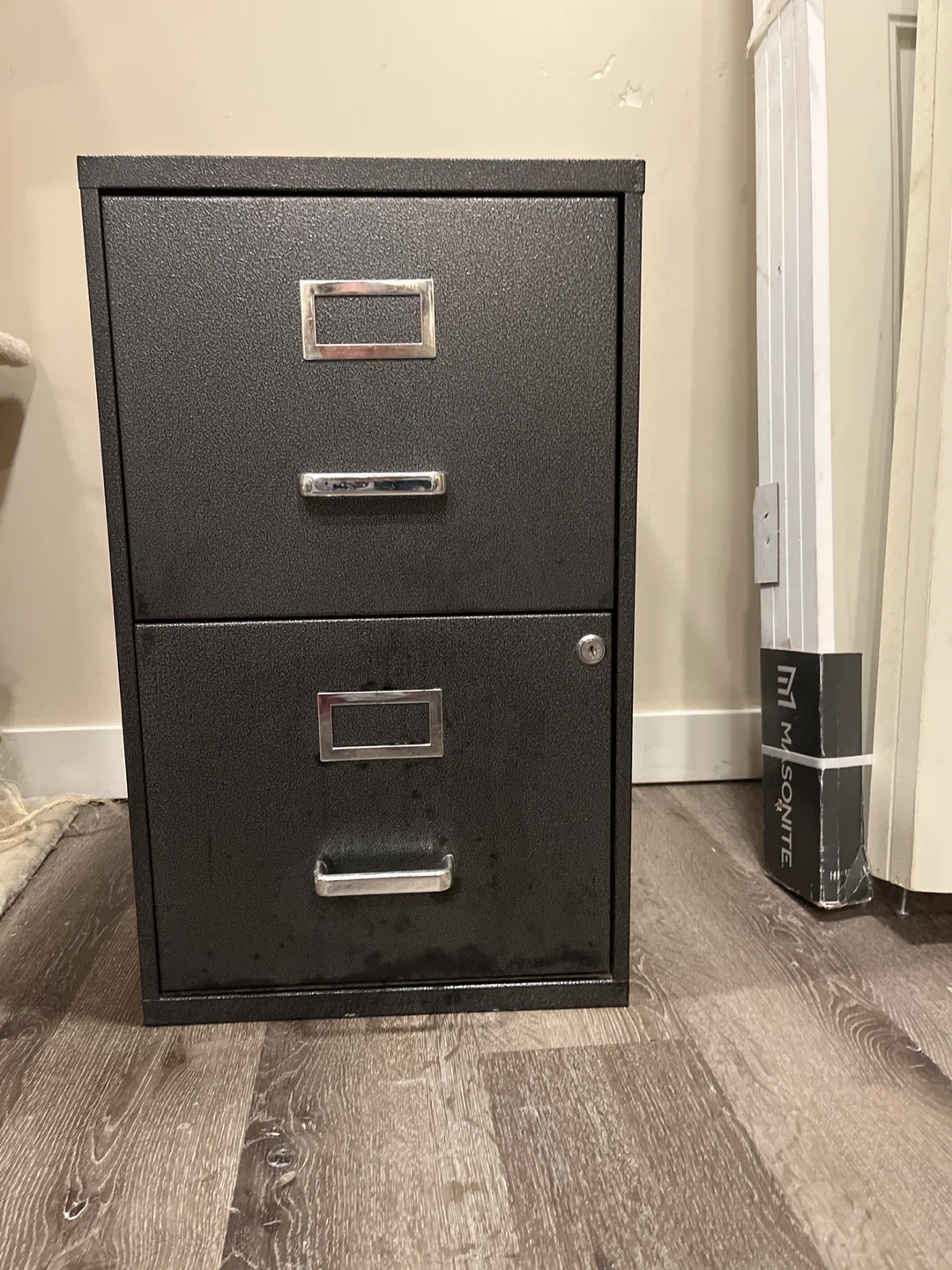 This is a black, two-drawer metal filing cabinet. It has silver handles and a lock with one key. It's a standard filing cabinet for documents.