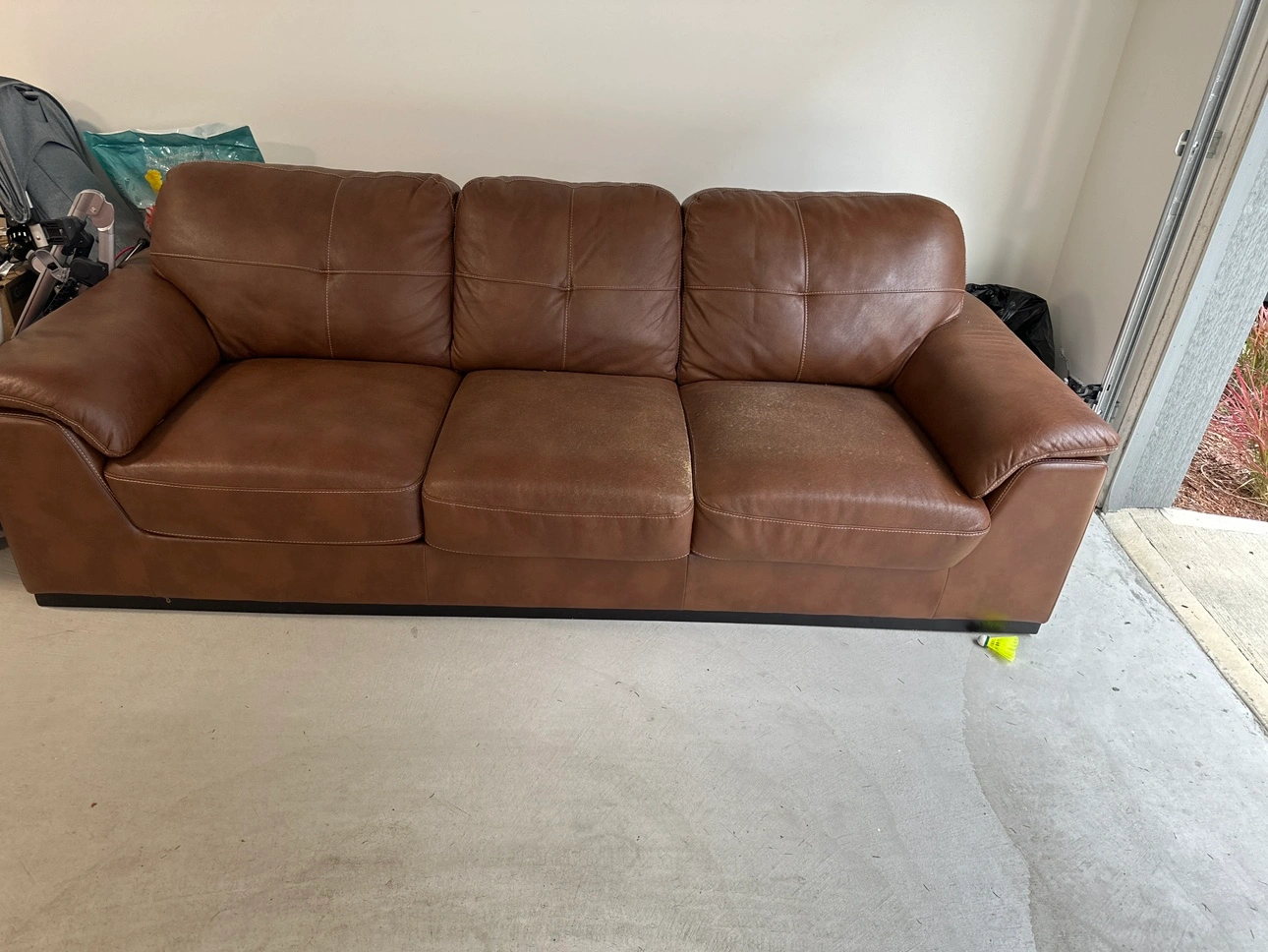 Three-seater sofa with a brown leather cover. And if need 2 seater with it free .The sofa has a black trim around the bottom edge. It is in used condition. Pick up only