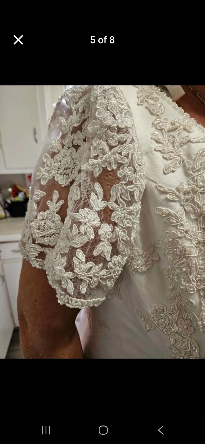Beautiful white wedding dress with intricate lace detailing and sleeveless with attachable long sleeves, short sleeves. The gown features delicate embroidery and a flattering V-neckline. It's perfect for your special day!