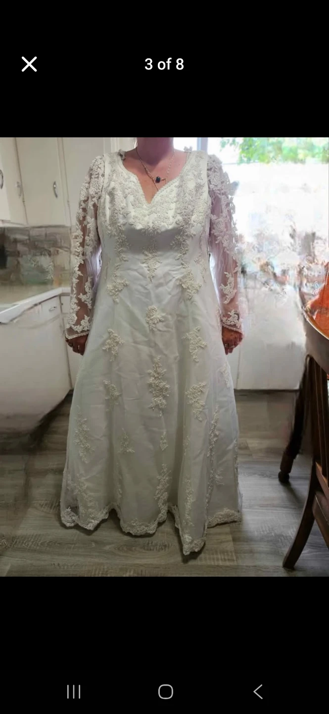 Beautiful white wedding dress with intricate lace detailing and sleeveless with attachable long sleeves, short sleeves. The gown features delicate embroidery and a flattering V-neckline. It's perfect for your special day!