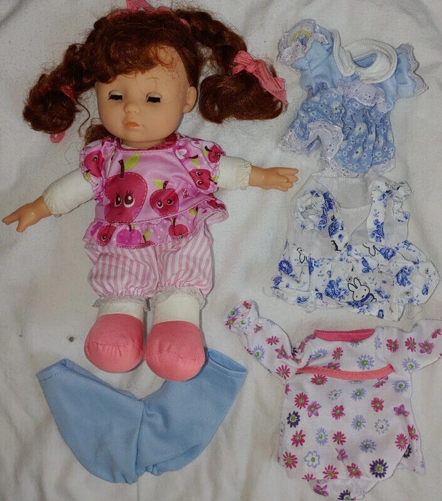 Baby cloth body doll with long brunette hair and blue gravity eyes (close laying down). Includes several outfits. $10.00 for the set. Located in Summerside, SE London. Smoke-free home. Message to arrange an afternoon/evening pickup. Check out my 900+ ads.