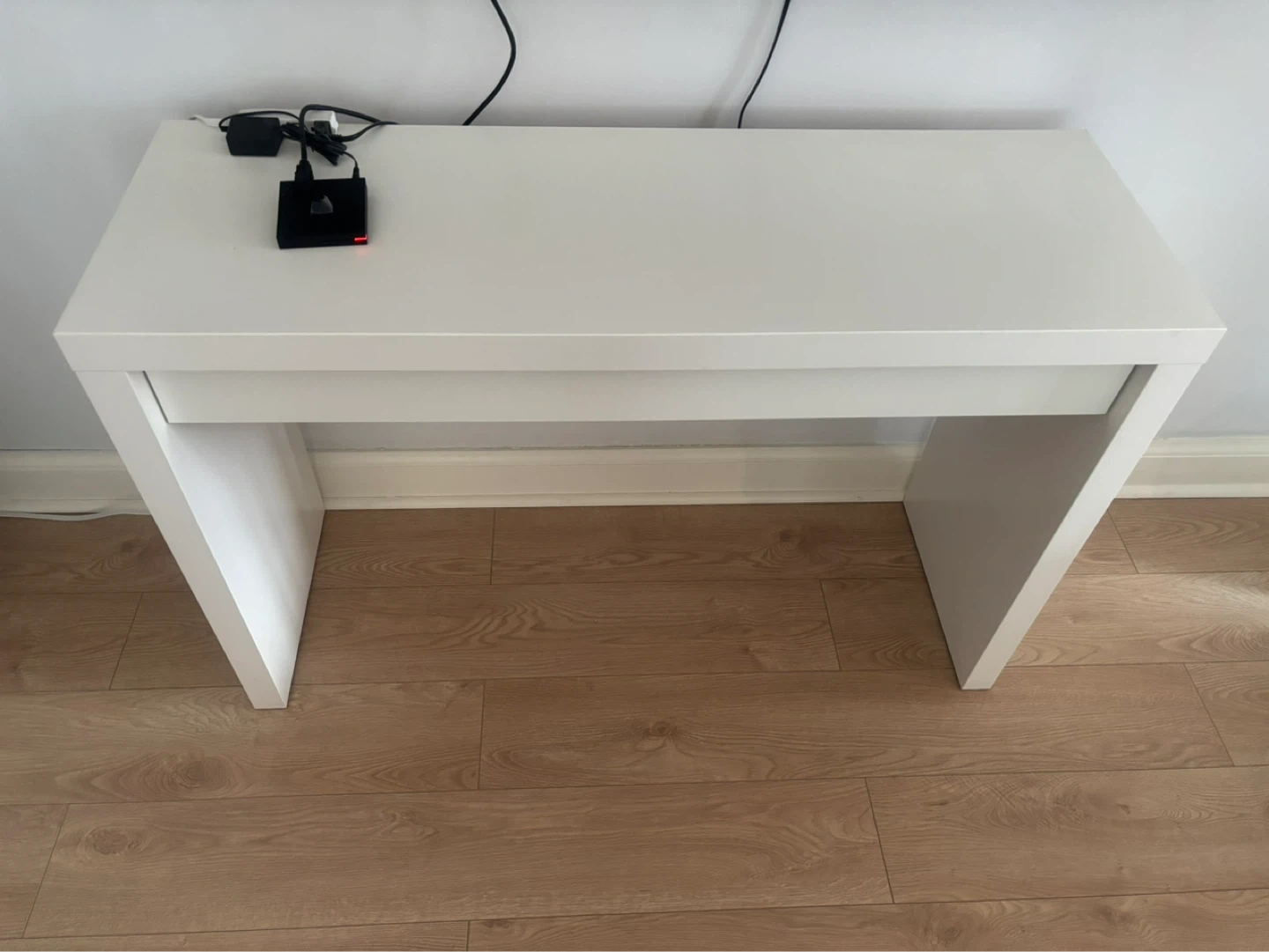 A simple white IKEA console table with a single drawer. Its clean lines make it a versatile piece for hallways or entryways or for a home office. Provides a convenient surface for keys or mail.