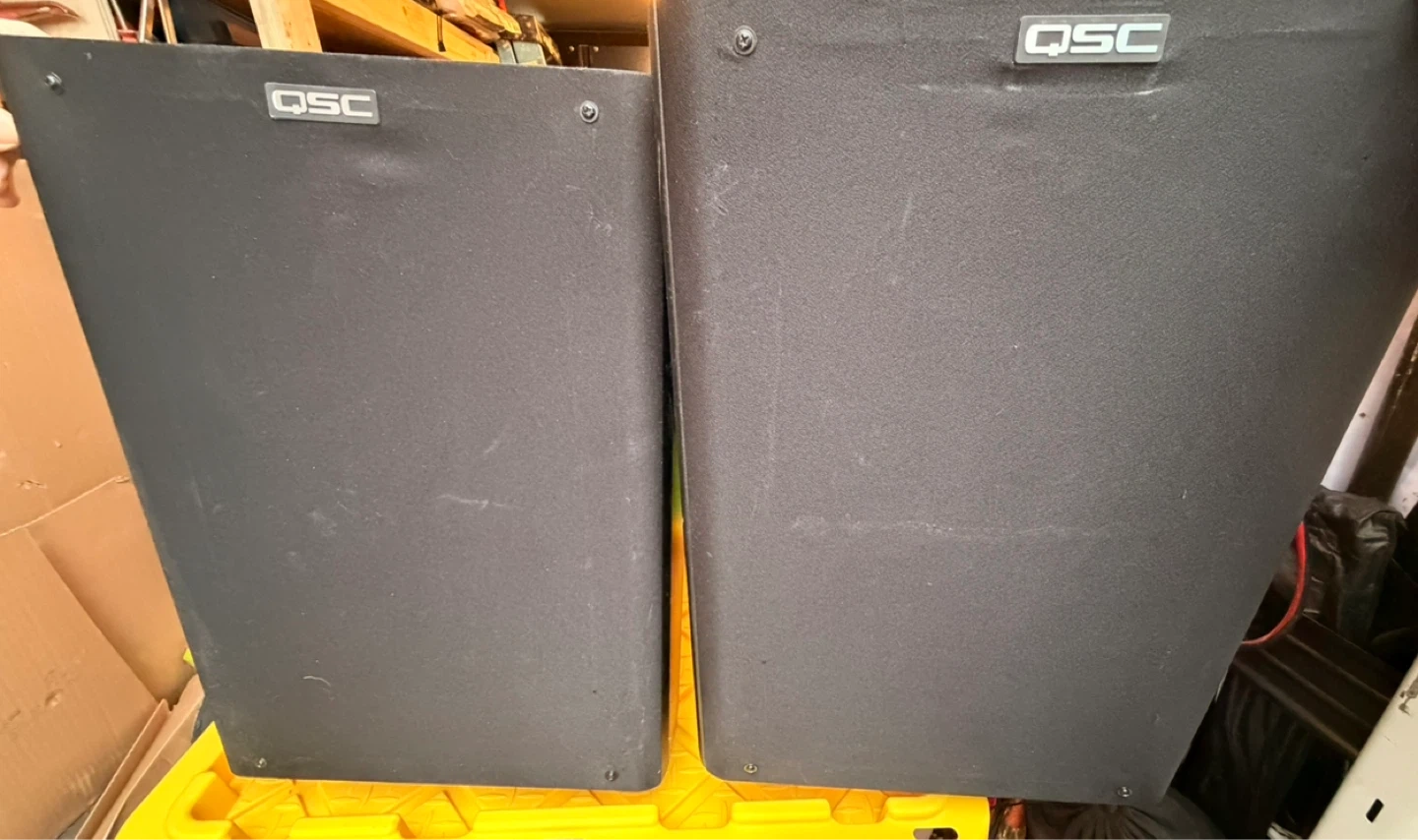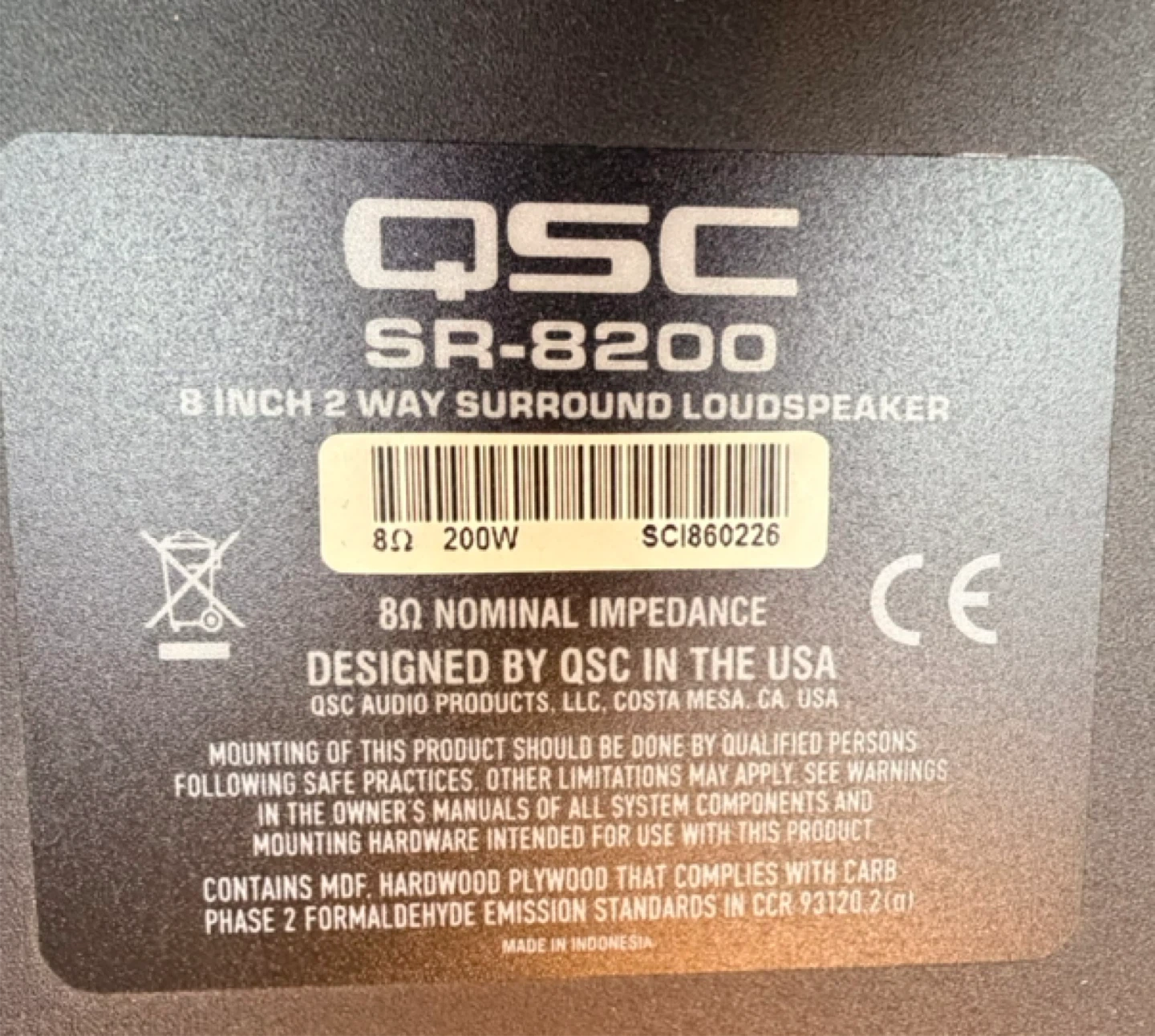 Selling a pair of QSC SR-8200 8-inch 2-way surround loudspeakers. They are designed by QSC in the USA. The speakers contain MDF, hardwood plywood that complies with CARB Phase 2 formaldehyde emission standards. They are 8Ω nominal impedance and 200W.