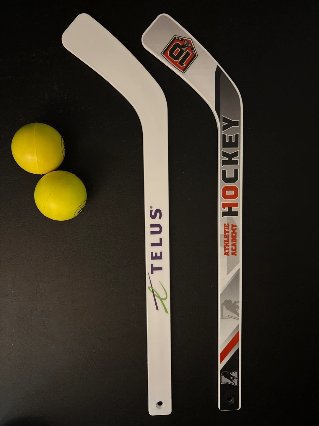 Selling two never used mini sticks, one Telus branded and the other from Athletic Academy. Also included are two yellow balls. Cash only!