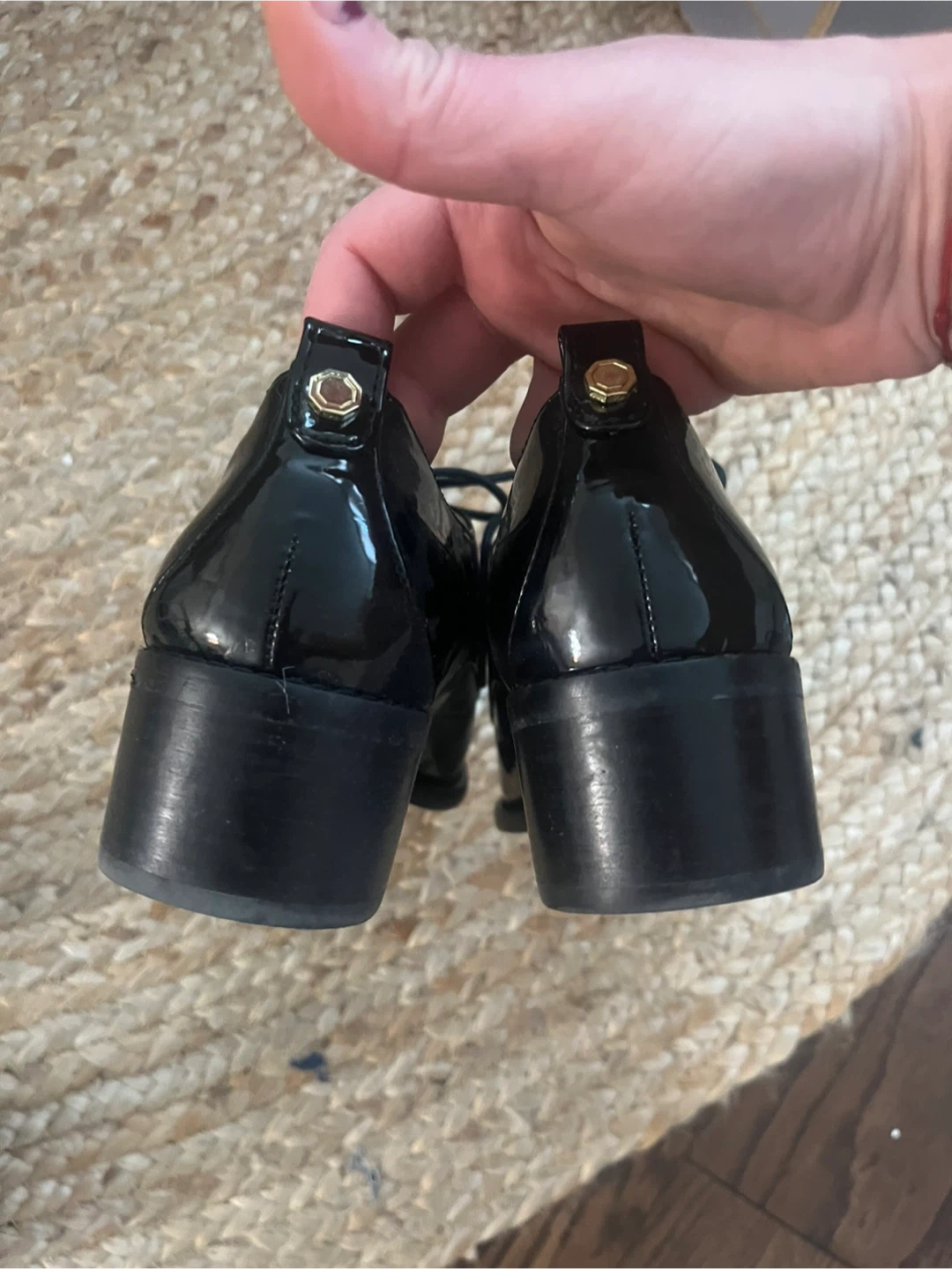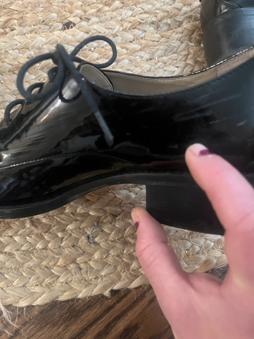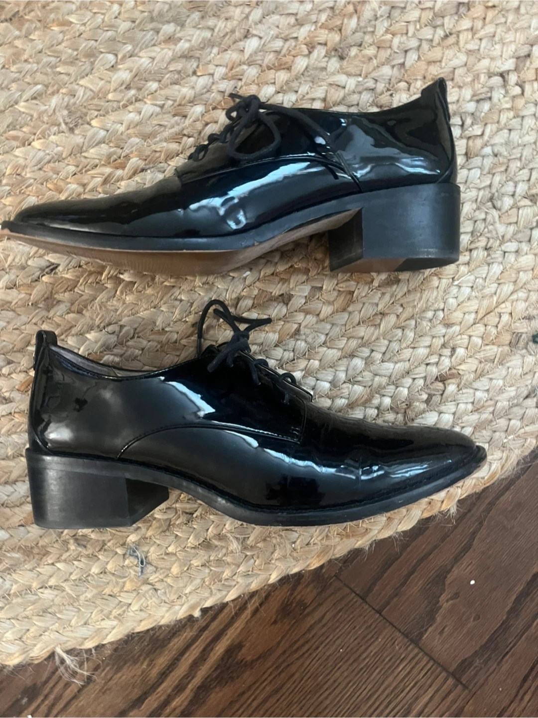 These are black patent leather lace-up shoes. They have a low block heel and a classic oxford design. These shoes offer a polished look for many occasions!