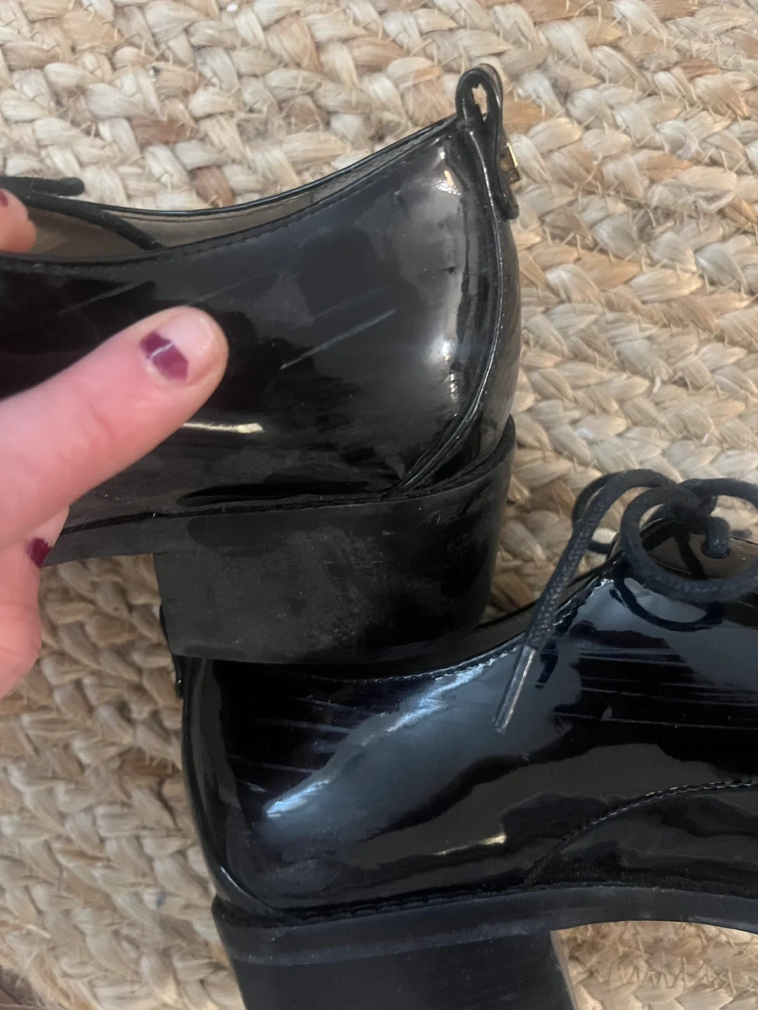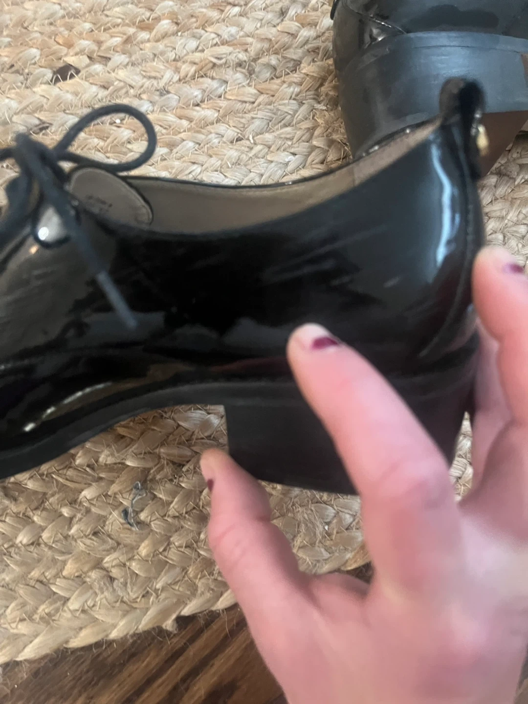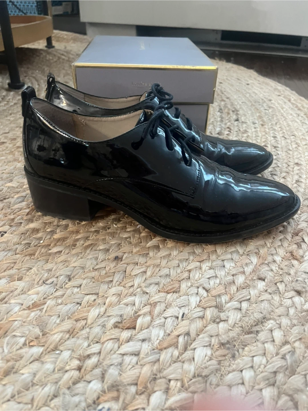 These are black patent leather lace-up shoes. They have a low block heel and a classic oxford design. These shoes offer a polished look for many occasions!