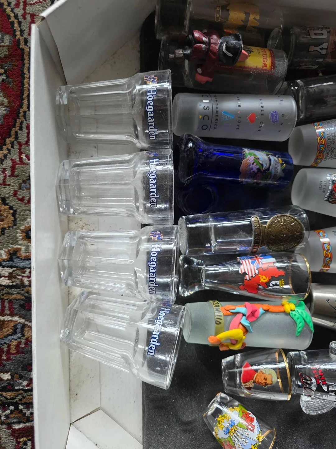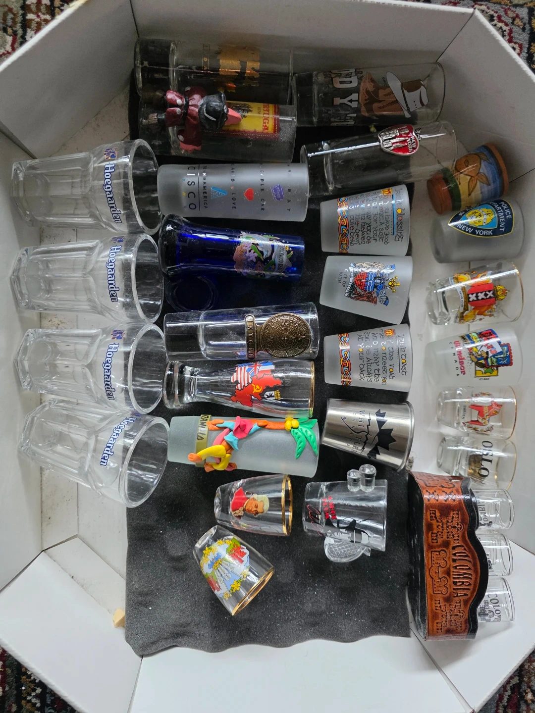 Mixed collection of shot glasses featuring various designs and logos from different locations + mini Hoegaarden glasses. Shot glasses from Amsterdam, Sweden, various Canadian cities, Wales, Austria, Germany, Mexico, New York, etc. Perfect for collectors or as unique barware!