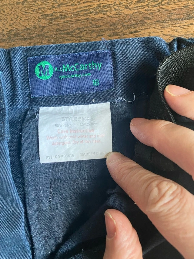 McCarthy brand uniform pants, perfect for school or formal occasions. These pants are a size 16 and are in used condition, but still have a lot of life left! They are made from 65% polyester and 35% cotton. If the ad is still up, the pants are available! Cash accepted.