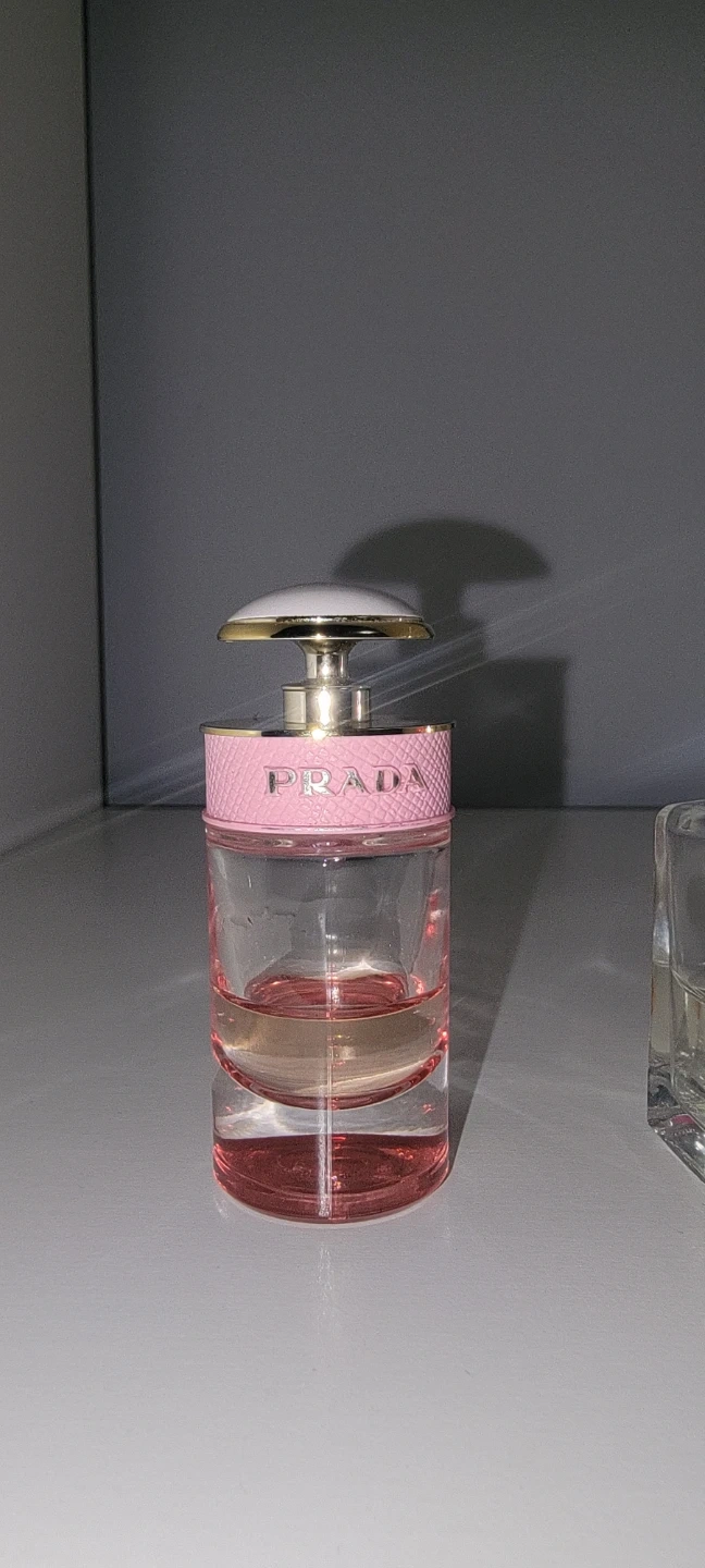 This 6.5ml mini PRADA Eau de Parfum for Women comes in a lovely pink bottle. The fragrance is housed in a clear glass bottle with a gold accent and a pink band around the neck. It's a beautiful scent for everyday wear.
