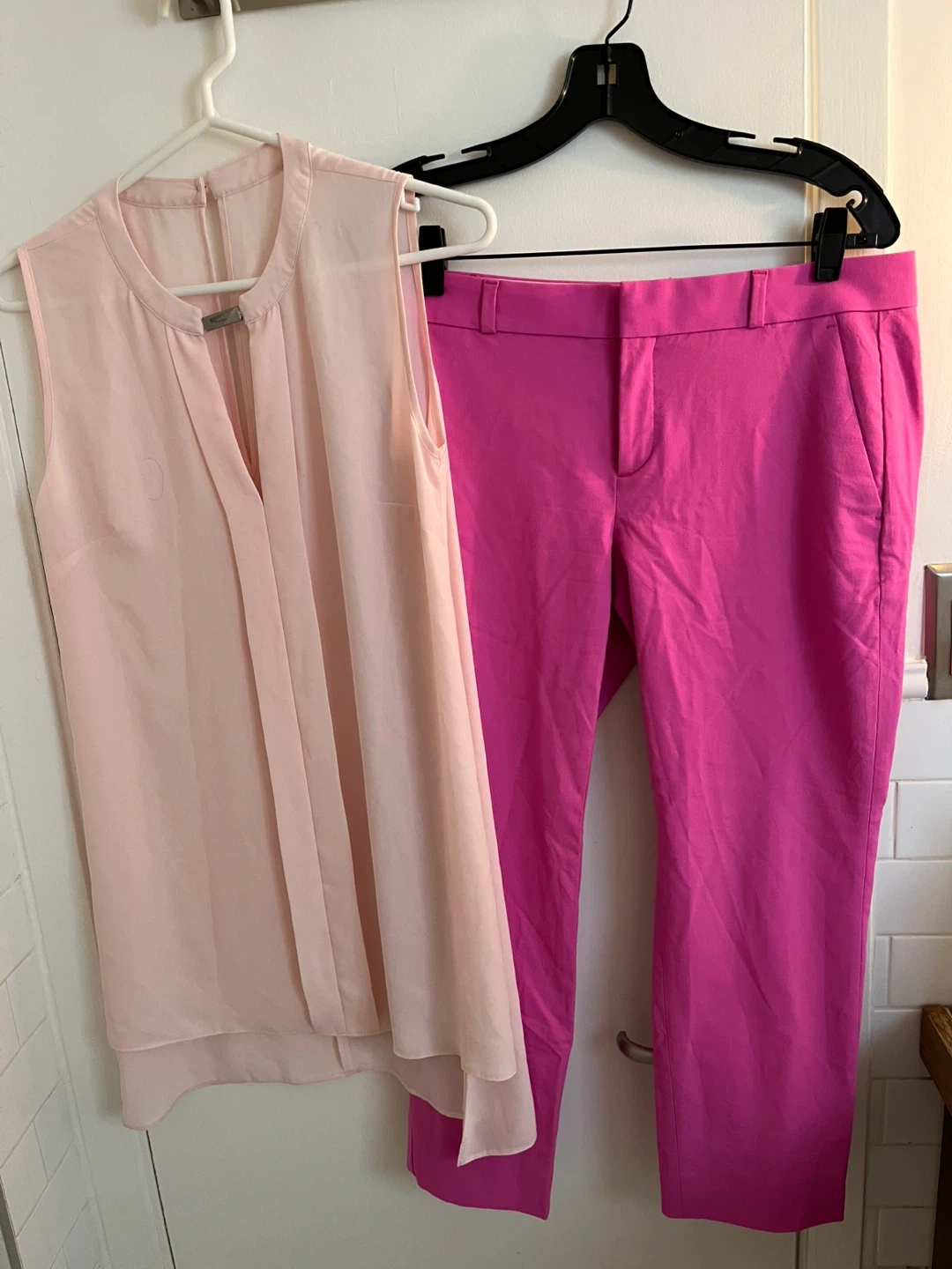 Pink top was a sample sale item. It is 18” pit to pit. Polyester
