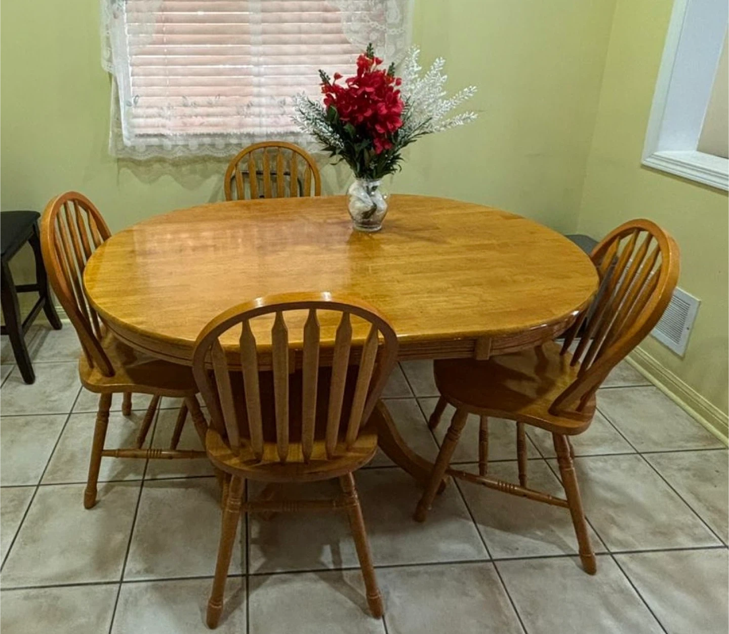 Solid wood dining set featuring an oval-shaped table with four matching spindle-back chairs. The wood has a warm, natural finish. This set is ready for family dinners!