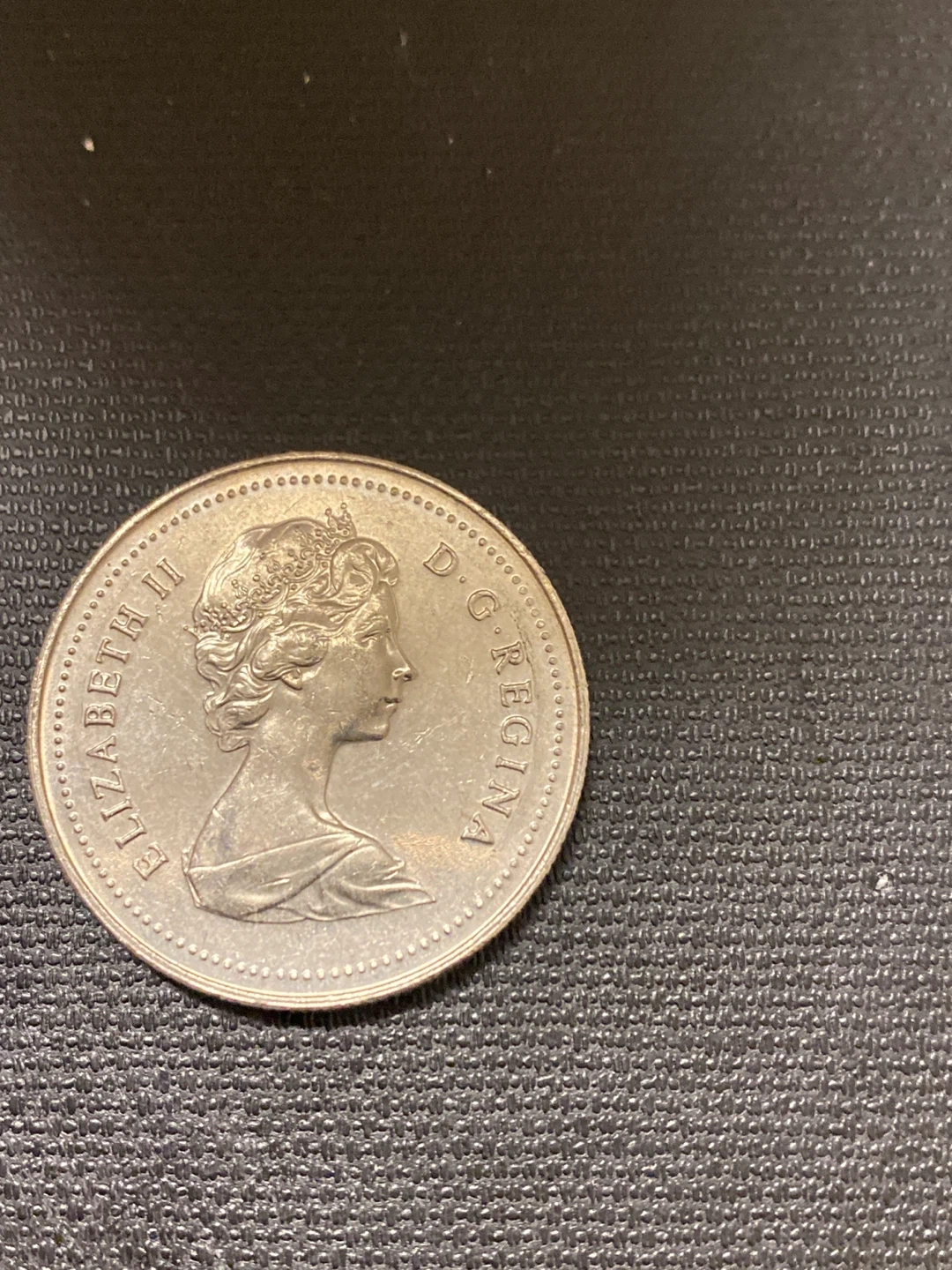 This is a 1985 Canadian dollar coin featuring Queen Elizabeth II on one side and a canoe scene on the other. It's a unique piece of Canadian currency.