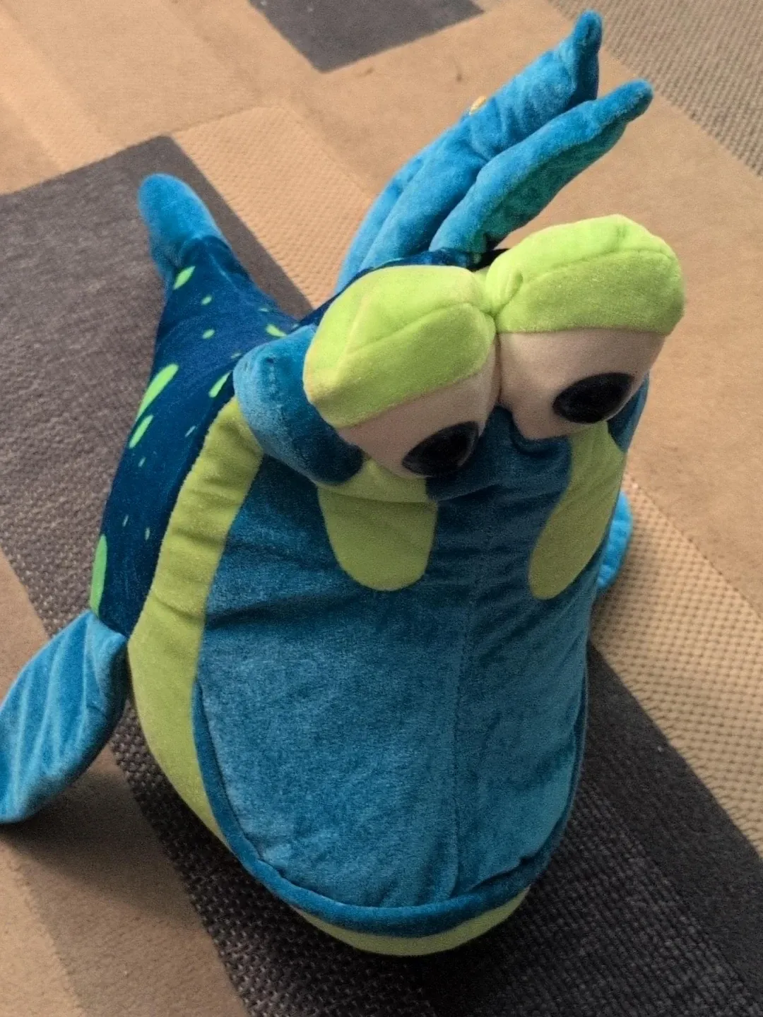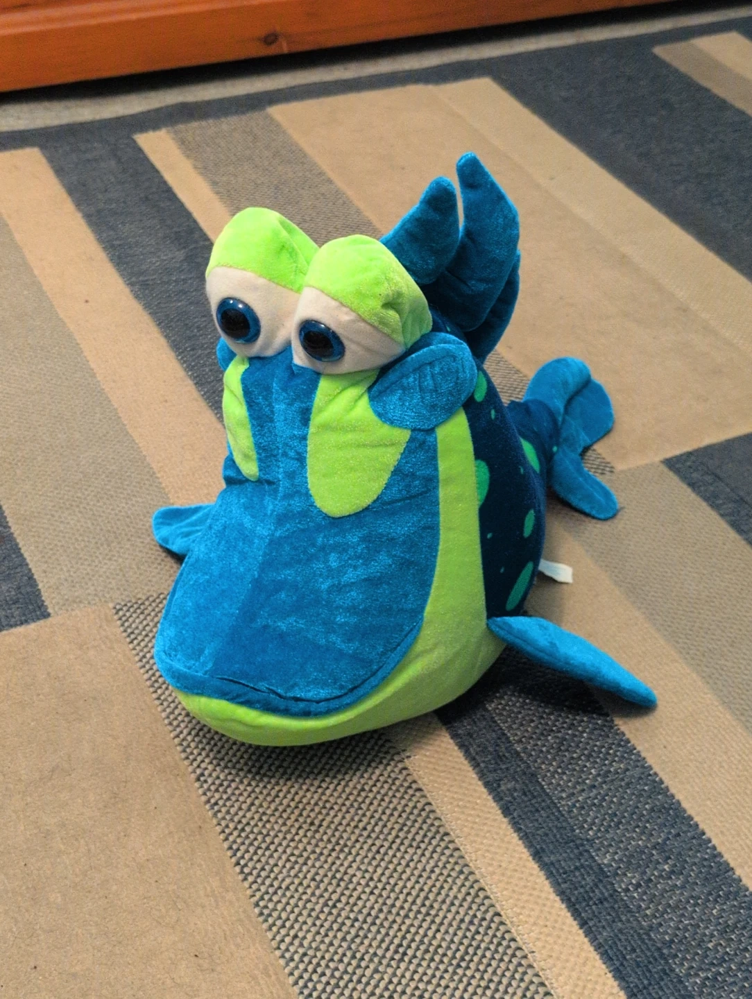It's a soft, plush toy shaped like a fish. The toy is blue with green accents and large googly eyes. It's soft and cuddly. Made of velour-like material.