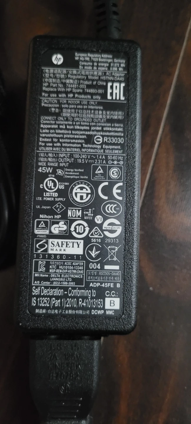 HP 45W AC adapter for laptops. Includes power cord. Input: 100-240V~, 1.5A. Output: 19.5V 2.31A. Part number ADP-45FE B.