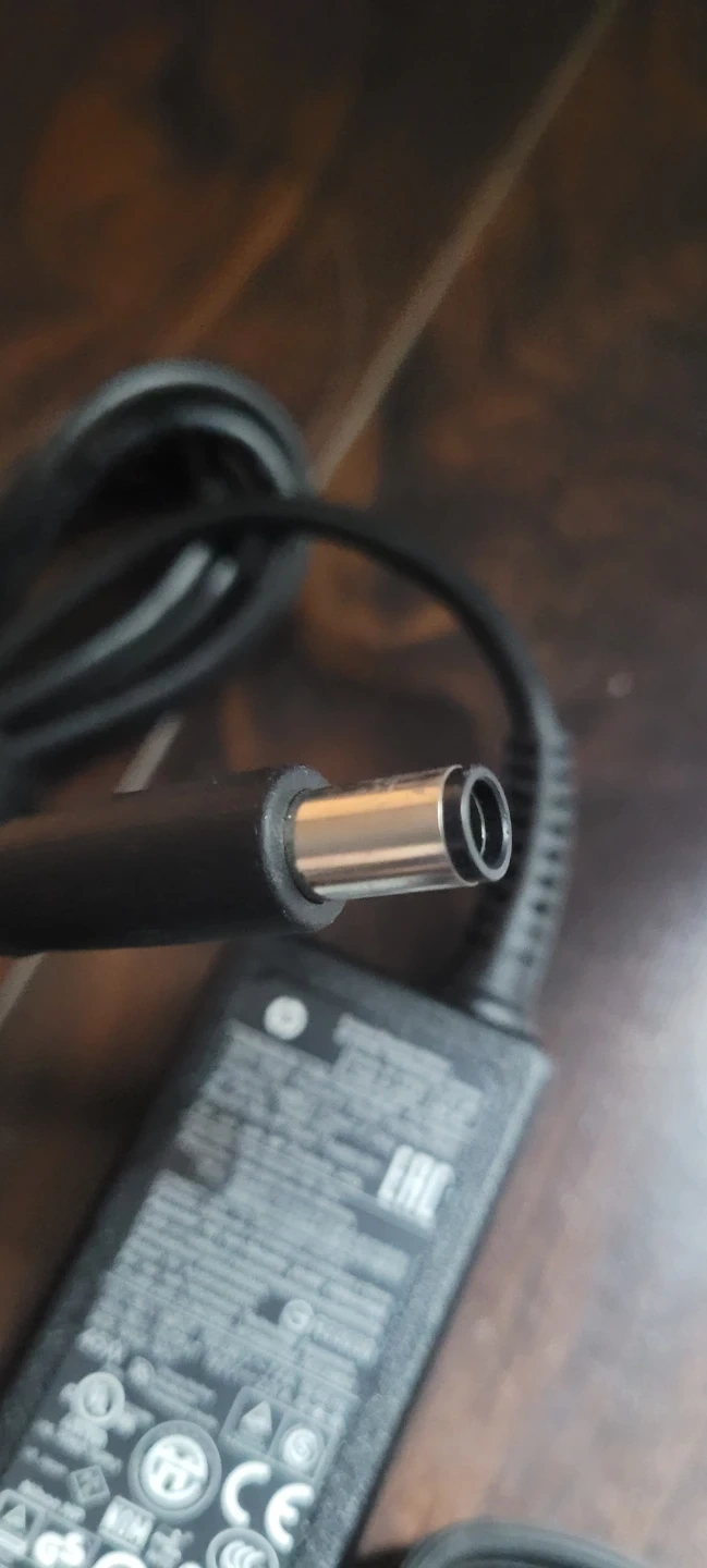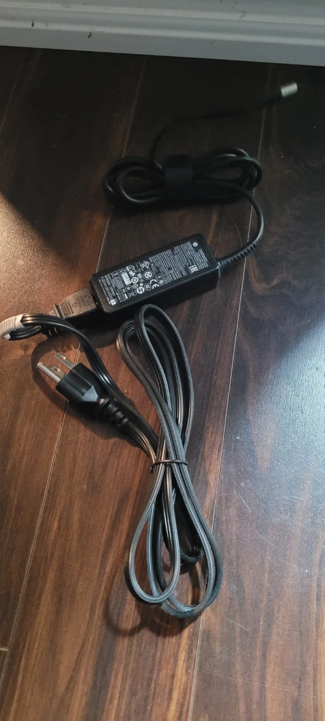 HP 45W AC adapter for laptops. Includes power cord. Input: 100-240V~, 1.5A. Output: 19.5V 2.31A. Part number ADP-45FE B.
