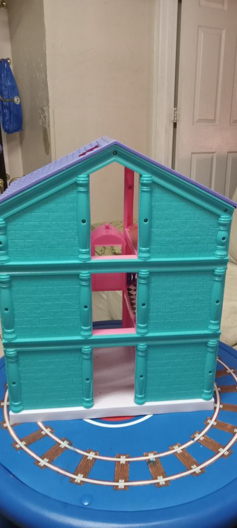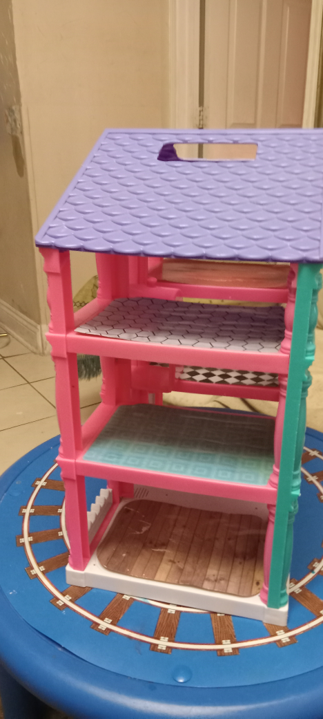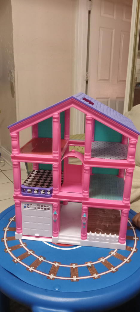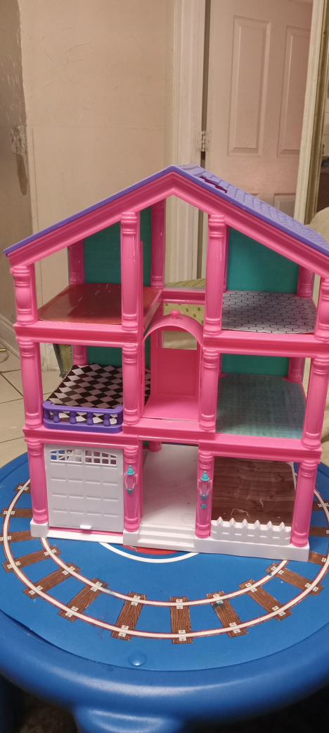 cute dollhouse with a pink and purple colour scheme! It's a three-story house with a garage. Perfect for your little one's dolls!