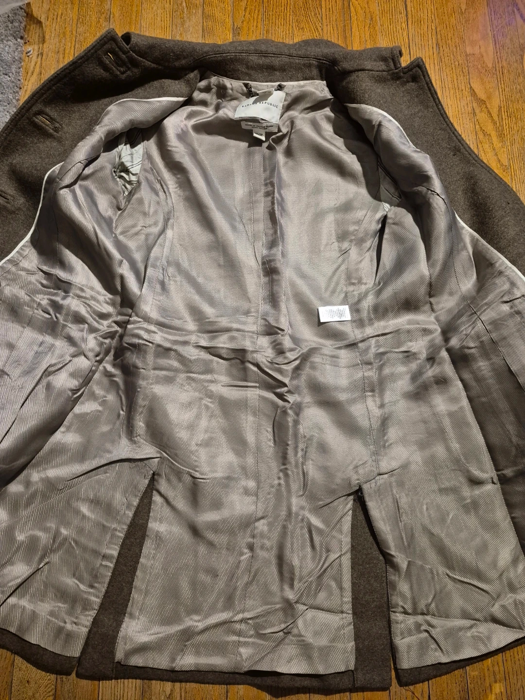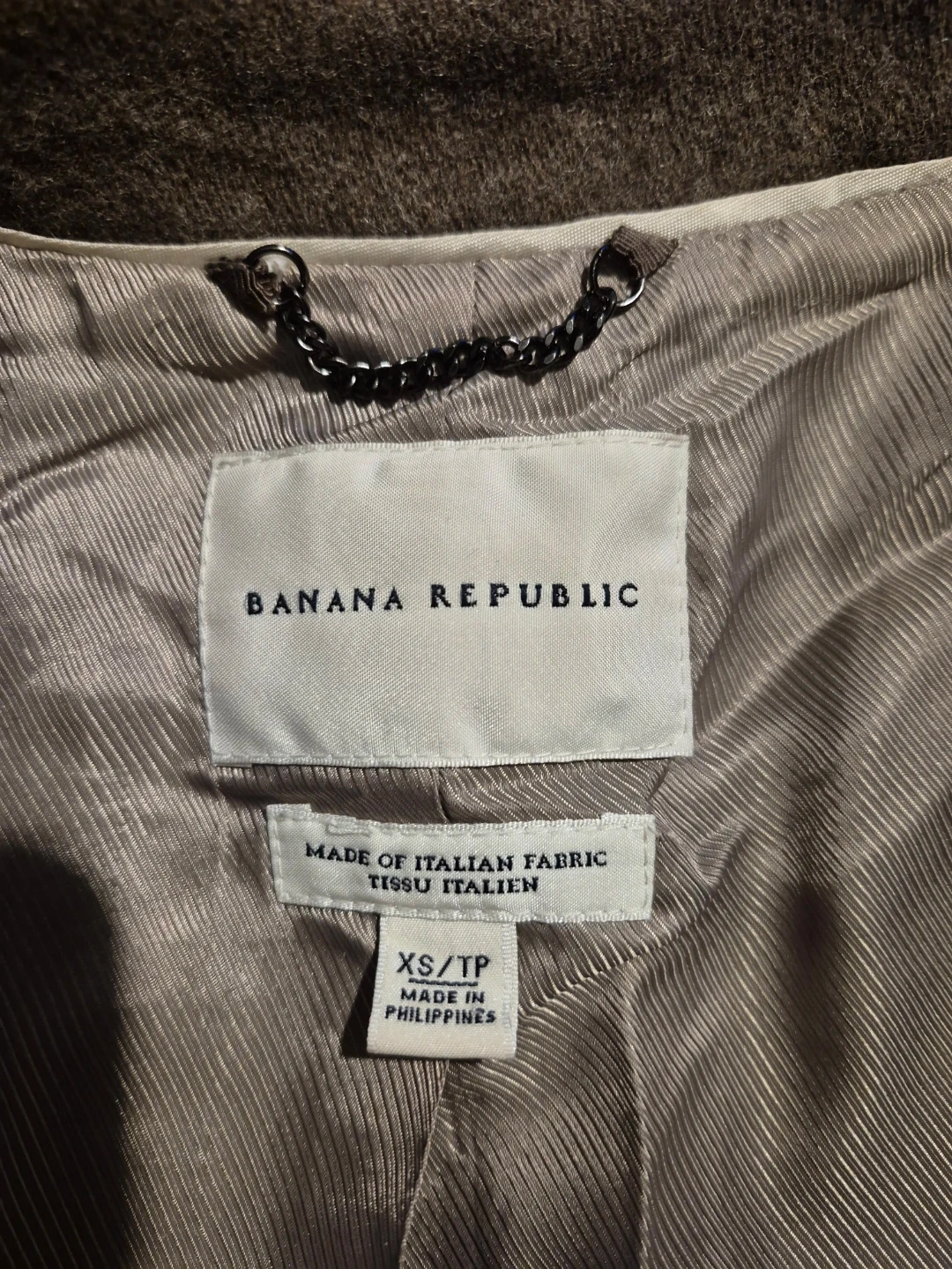 This Banana Republic coat is made of Italian fabric. It's a size XS/TP and was made in the Philippines. Its classic design makes it suitable for various occasions.