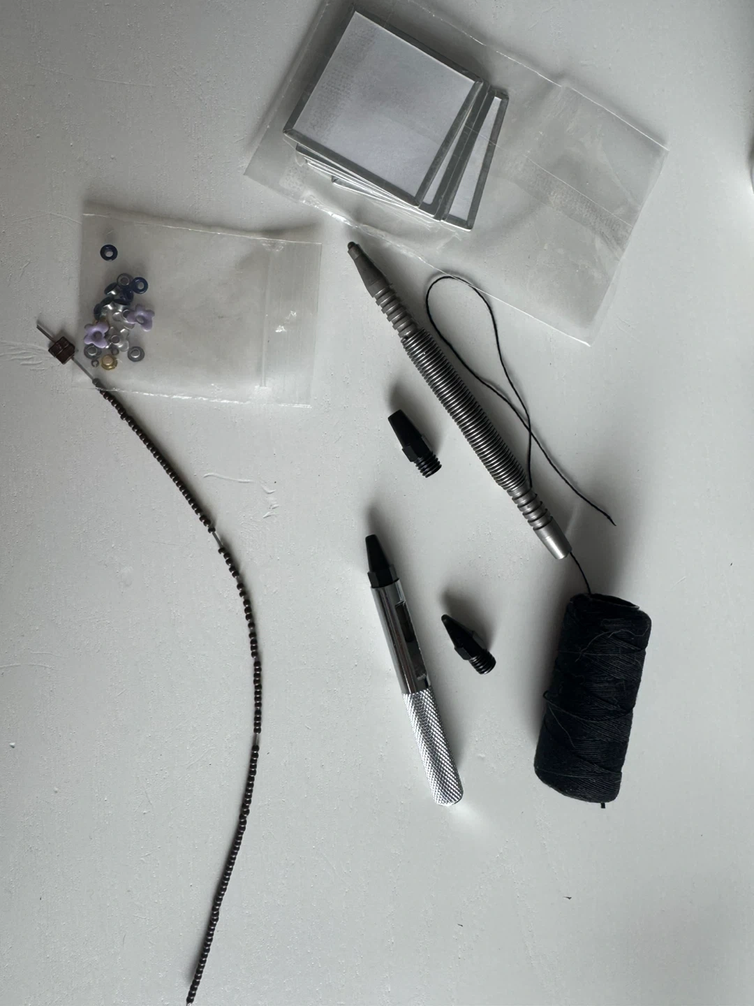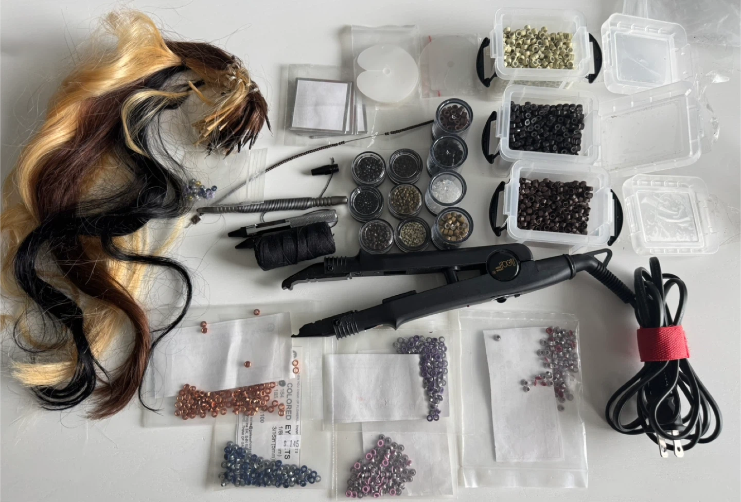 Complete set for hair extensions using micro rings / micro beads. Perfect for hairstylists, students, or anyone practicing hair extension techniques.