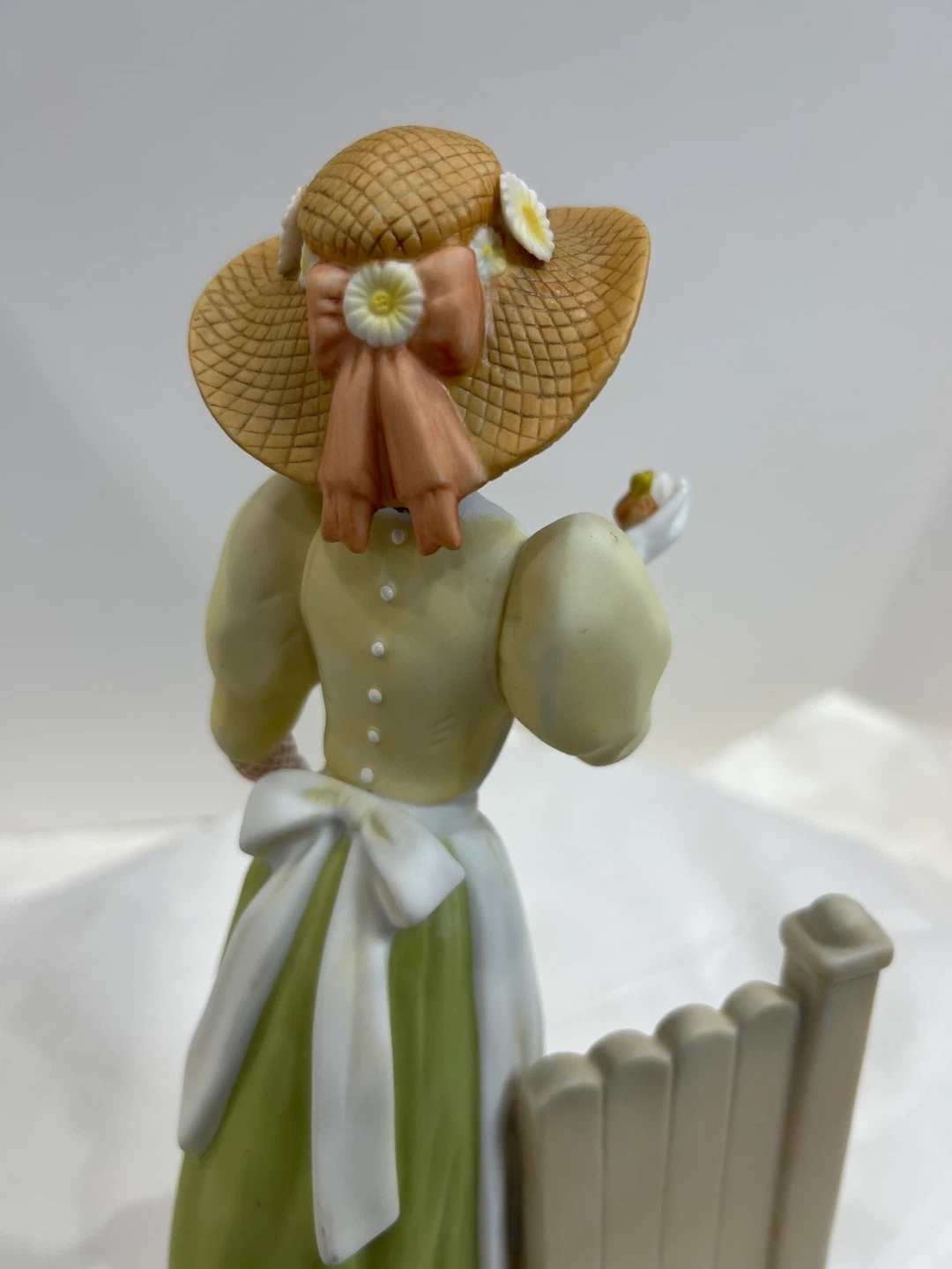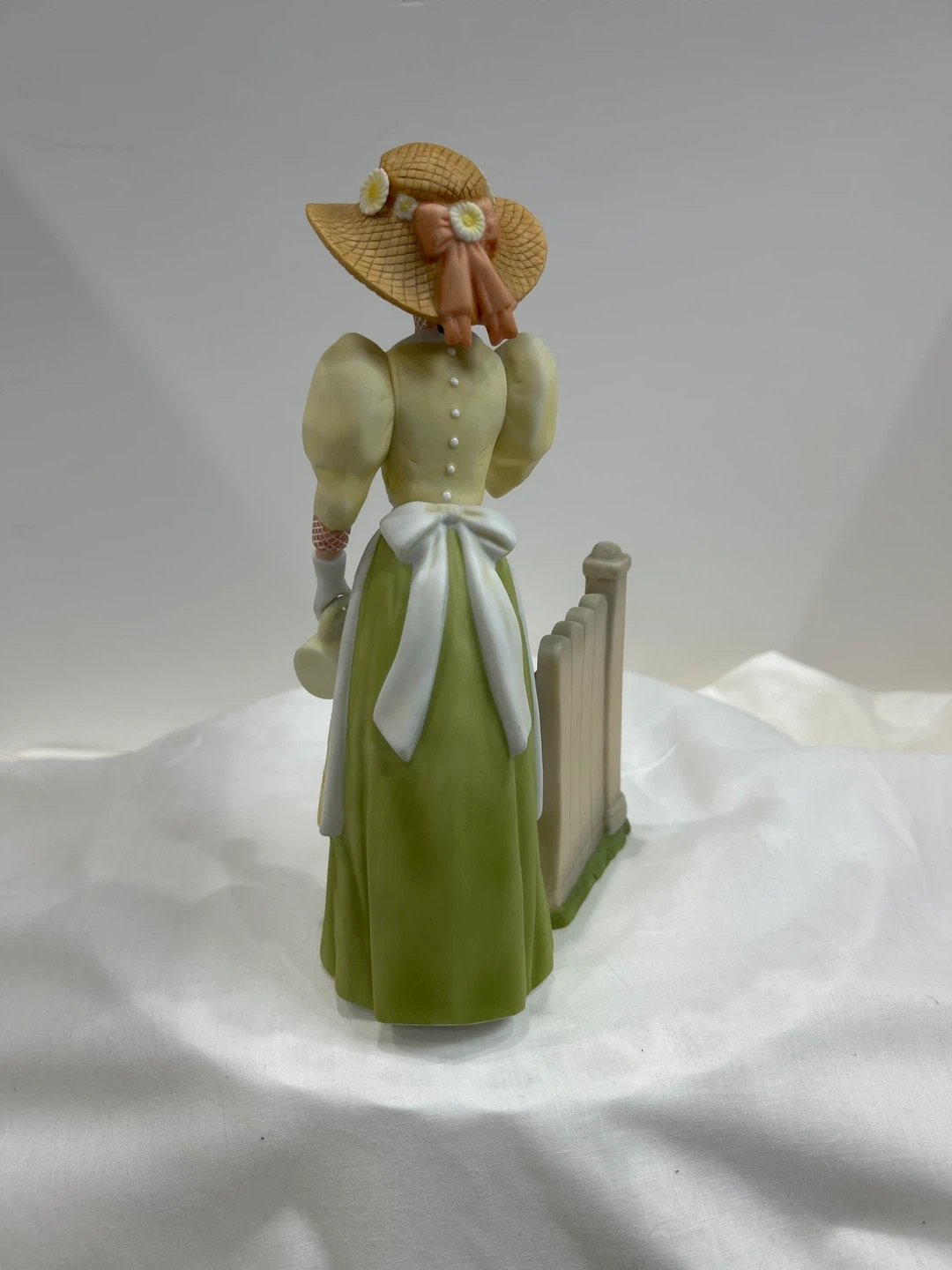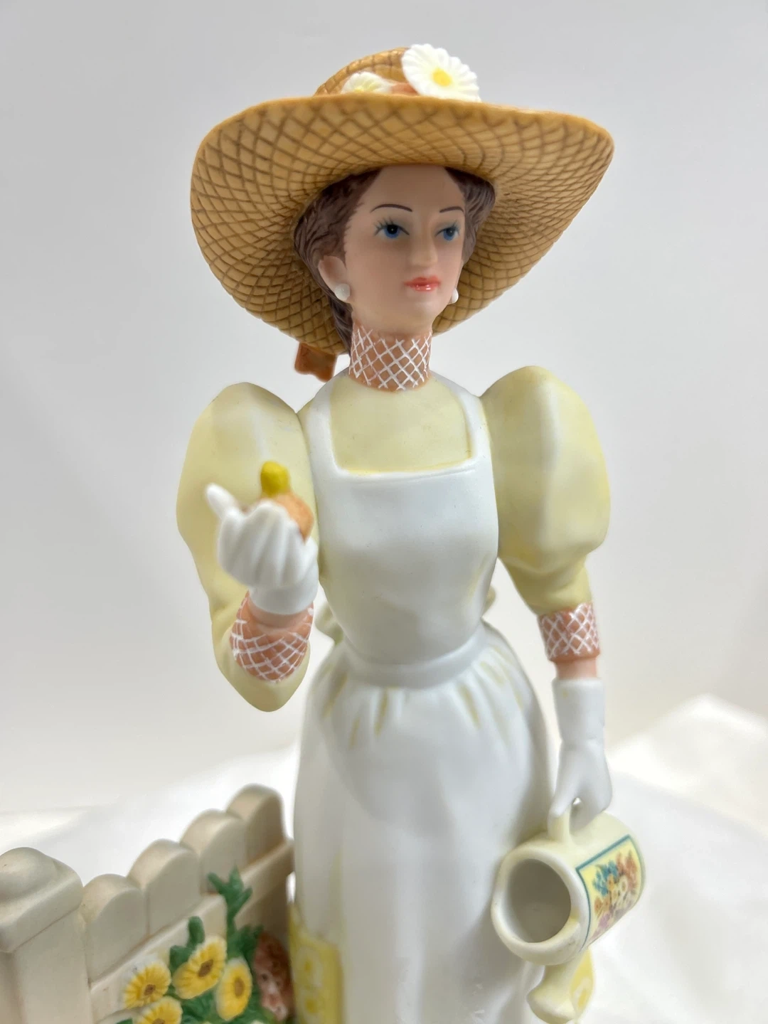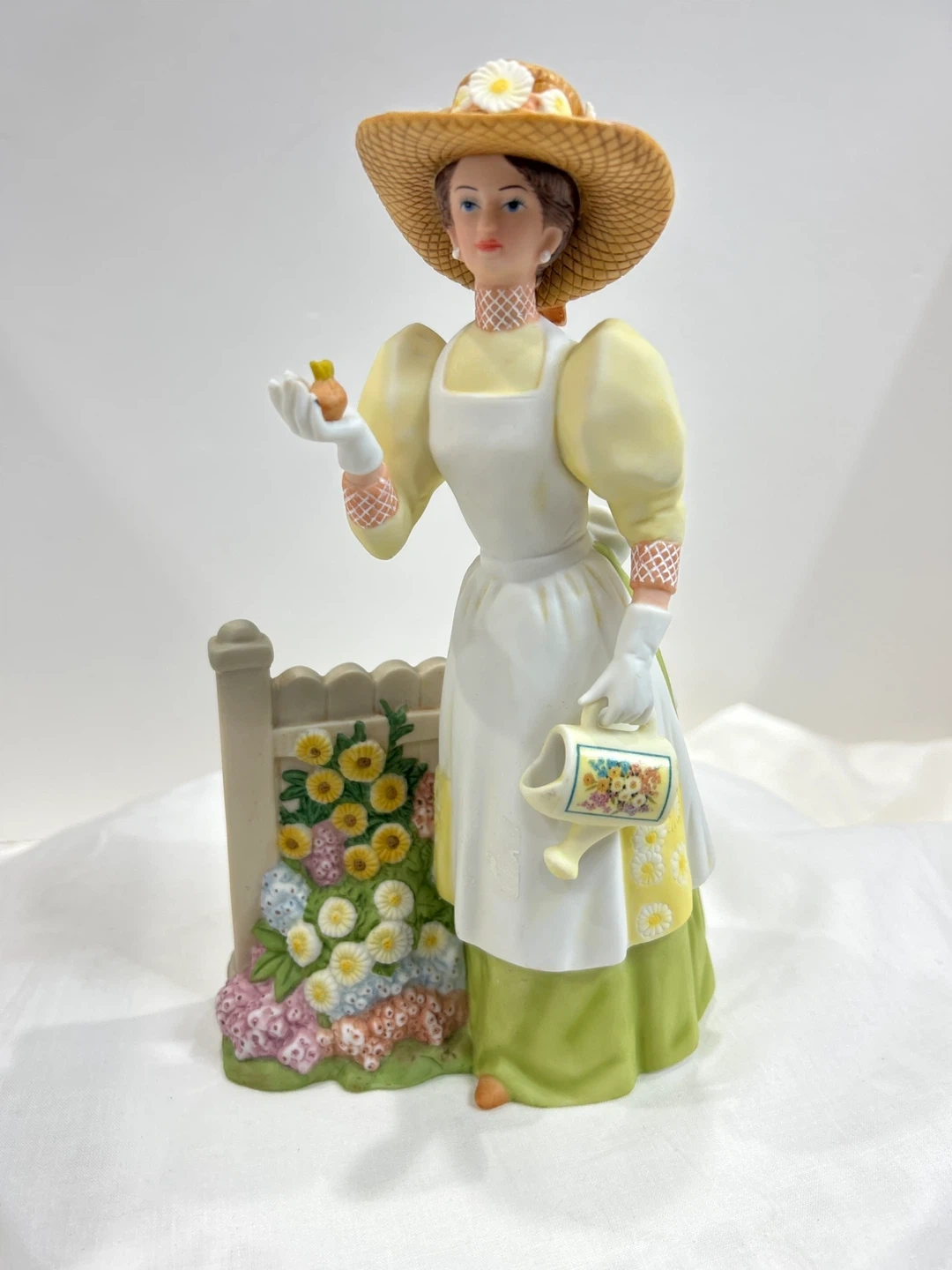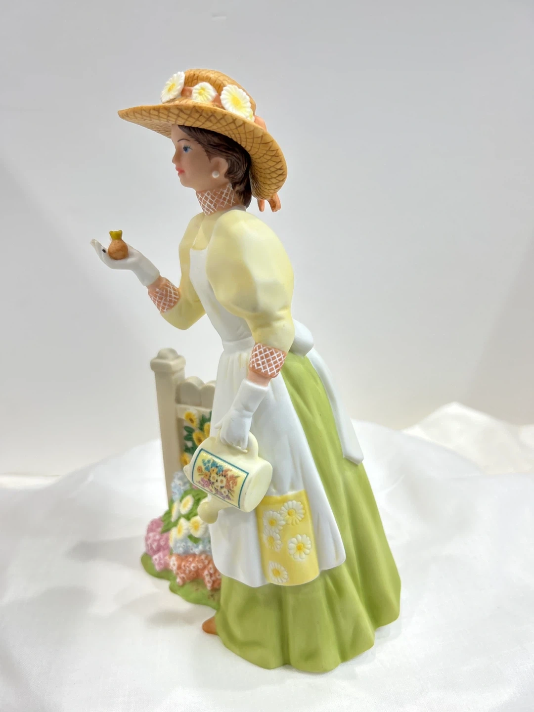Vintage 2008 Mrs Albee award This charming porcelain figurine depicts a lady in a straw hat, holding a small bird and a decorative watering can. It's a lovely piece with floral accents around a white picket fence. The detailing on her dress, apron, and the surrounding flowers is exquisite! Collectible ๐