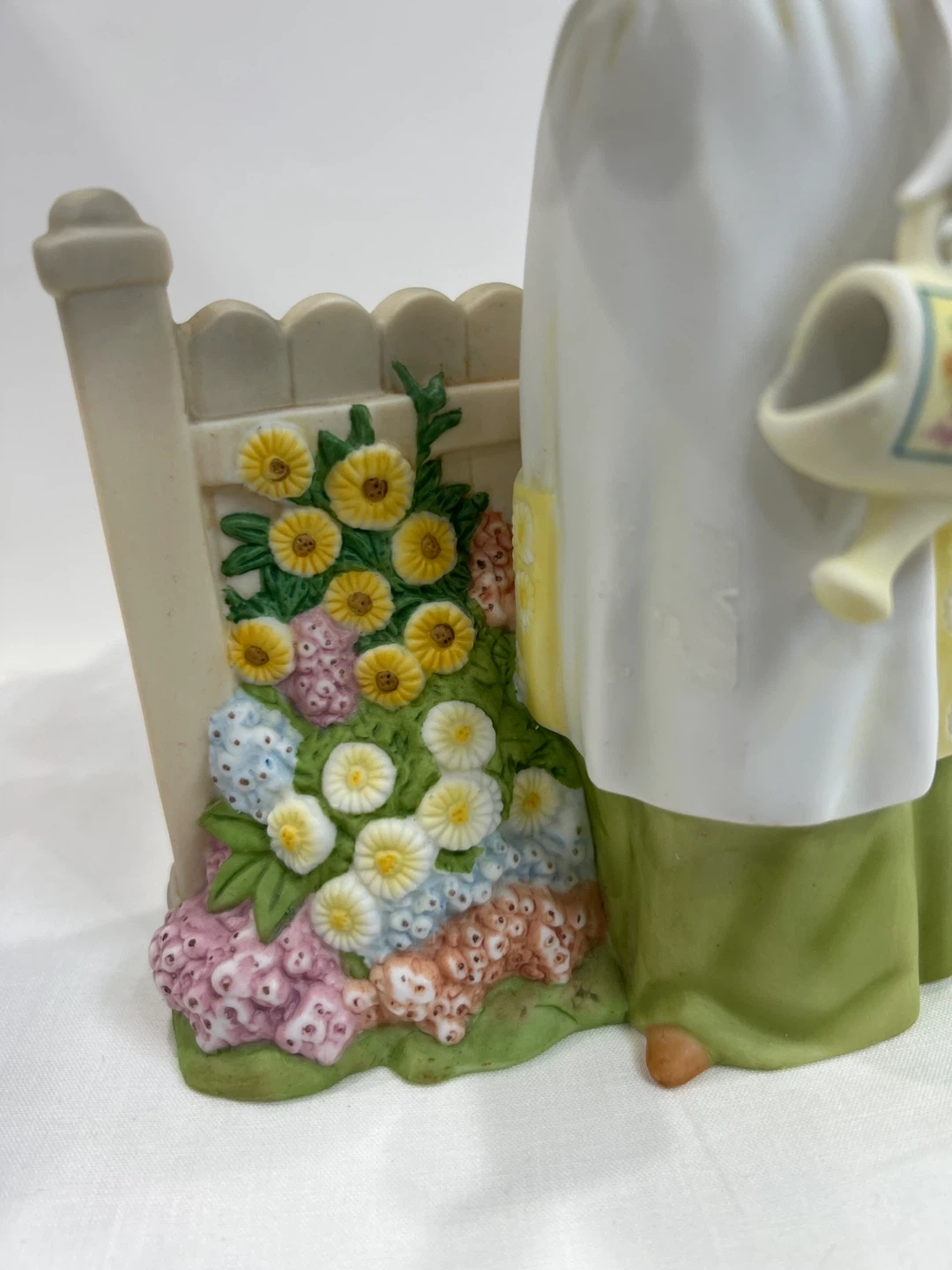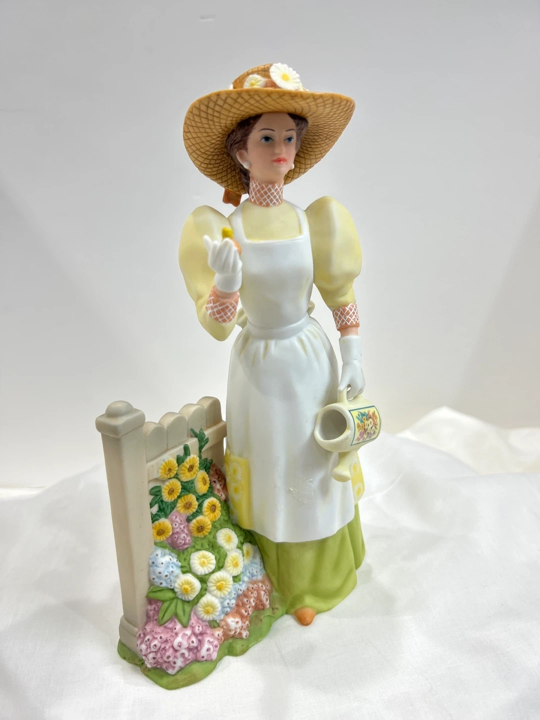 Vintage 2008 Mrs Albee award This charming porcelain figurine depicts a lady in a straw hat, holding a small bird and a decorative watering can. It's a lovely piece with floral accents around a white picket fence. The detailing on her dress, apron, and the surrounding flowers is exquisite! Collectible ๐