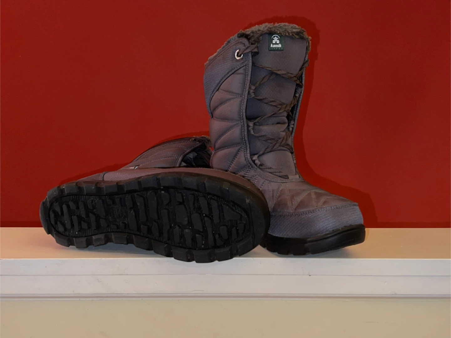 Like new! Cozy and warm Kamik winter boots in a stylish grey colour. These boots will keep your feet snug and dry.