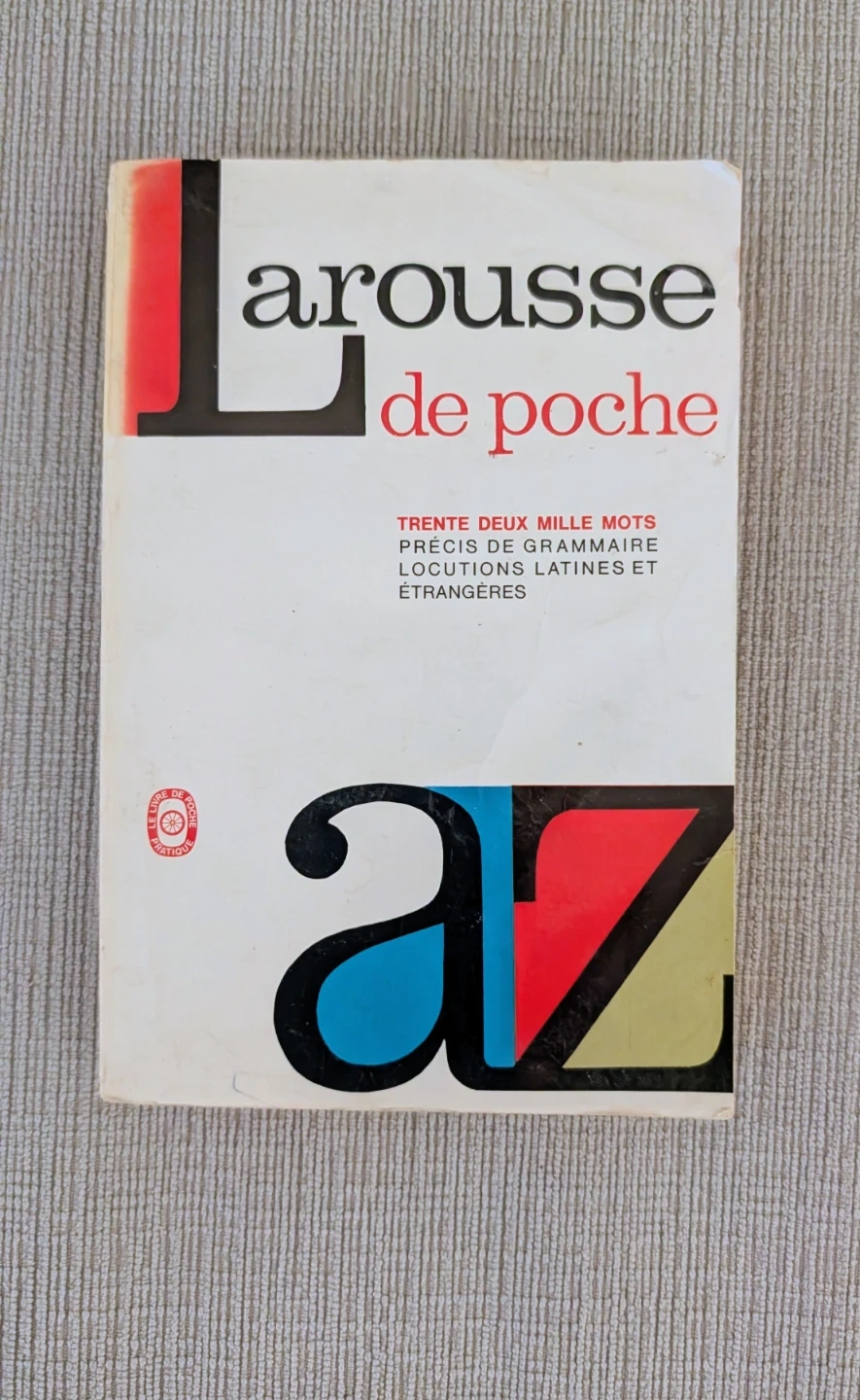 This is a Larousse de Poche dictionary. It contains thirty-two thousand words, a precise grammar, and Latin and foreign phrases. It's a handy reference for language learners.