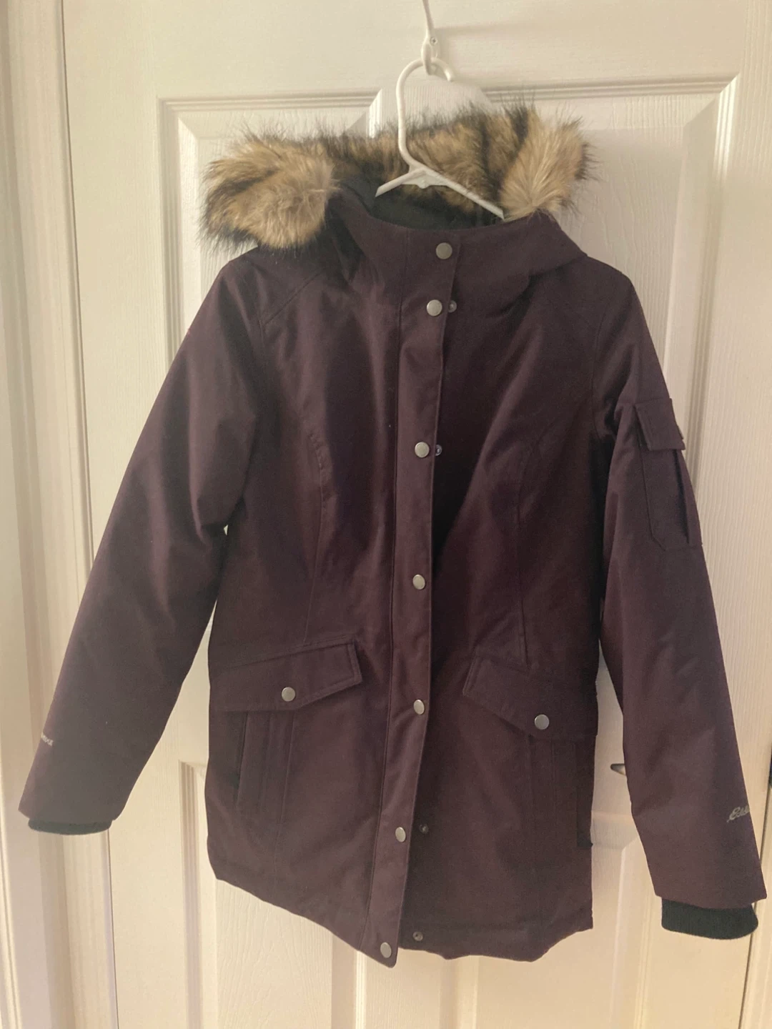 Eddie Bauer winter parka in women's size XS. It fits size S though. It features a faux fur-trimmed hood and a flattering fit.