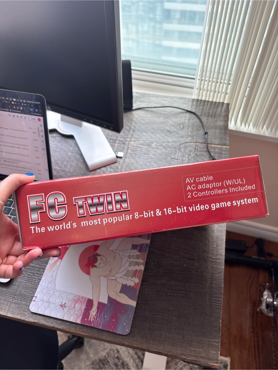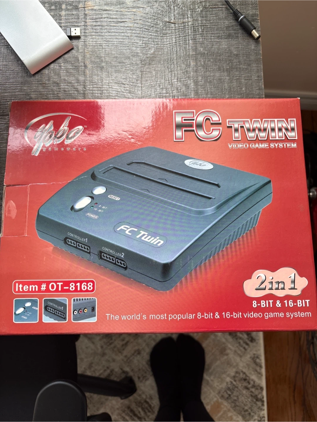This FC Twin video game system plays both 8-bit and 16-bit games. It comes with the console, AV cable, AC adapter, and two controllers. It's ready for retro gaming fun!