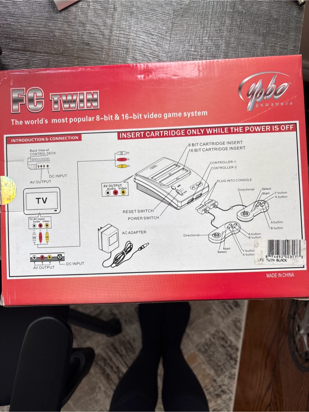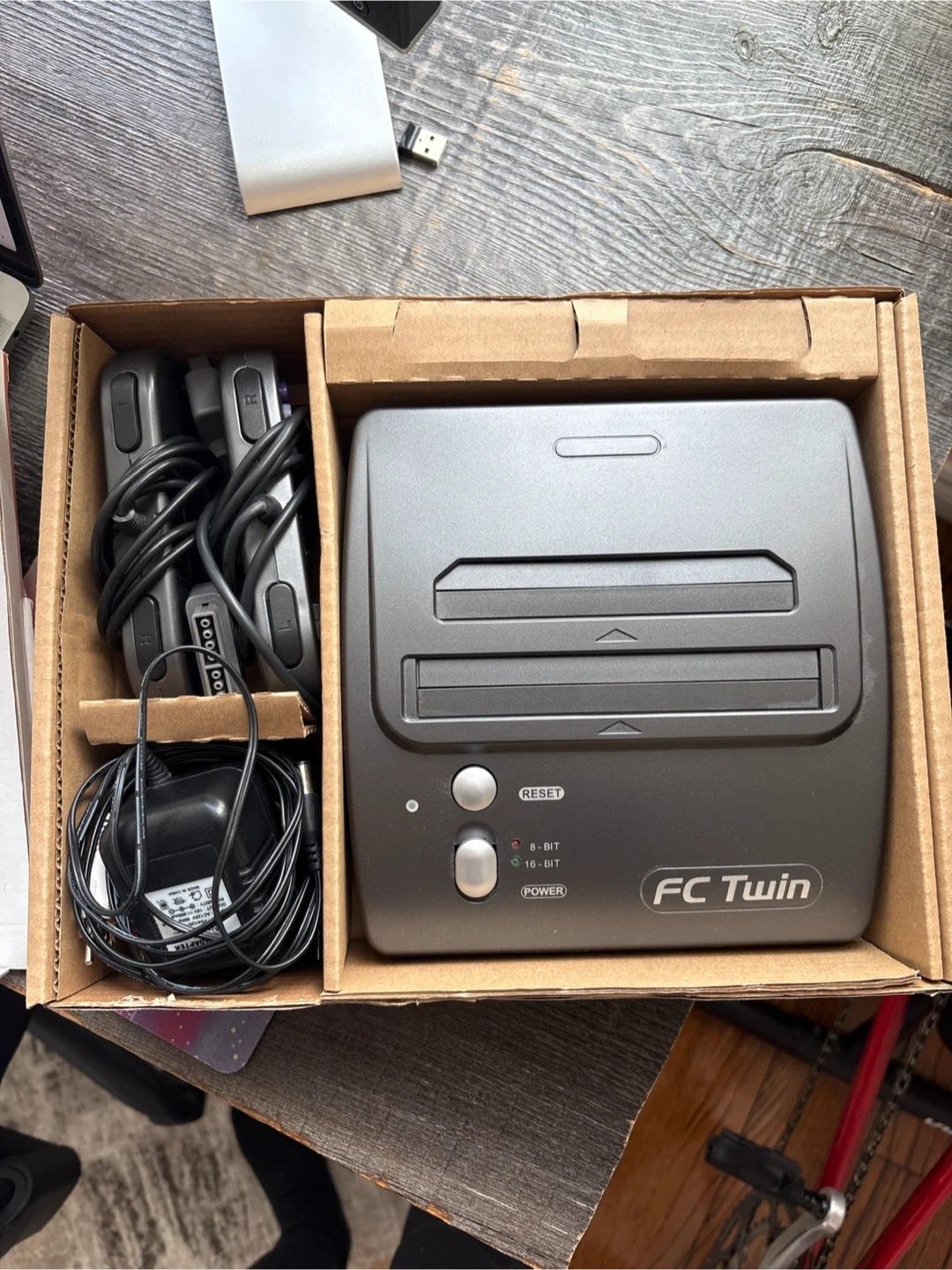 This FC Twin video game system plays both 8-bit and 16-bit games. It comes with the console, AV cable, AC adapter, and two controllers. It's ready for retro gaming fun!