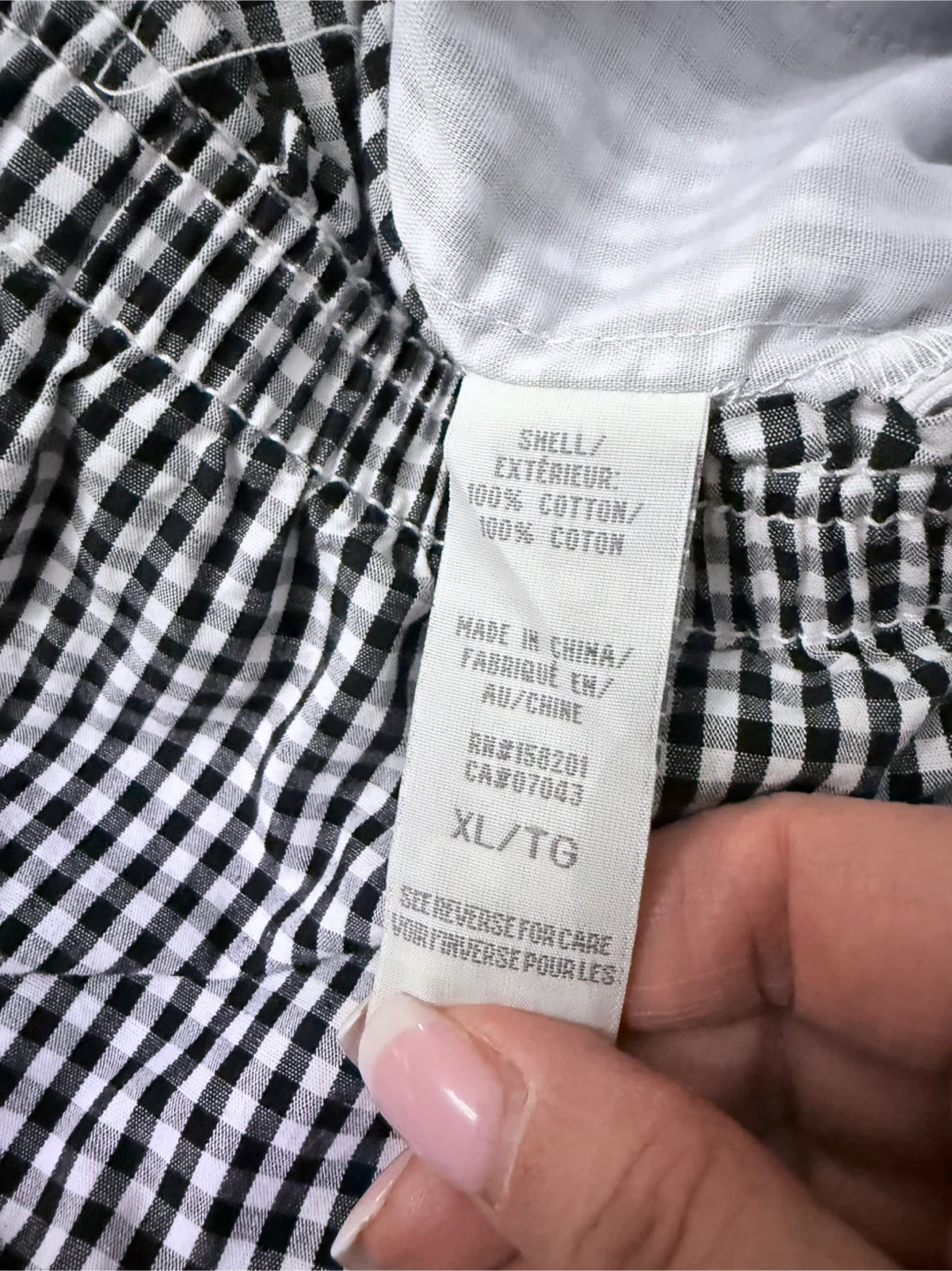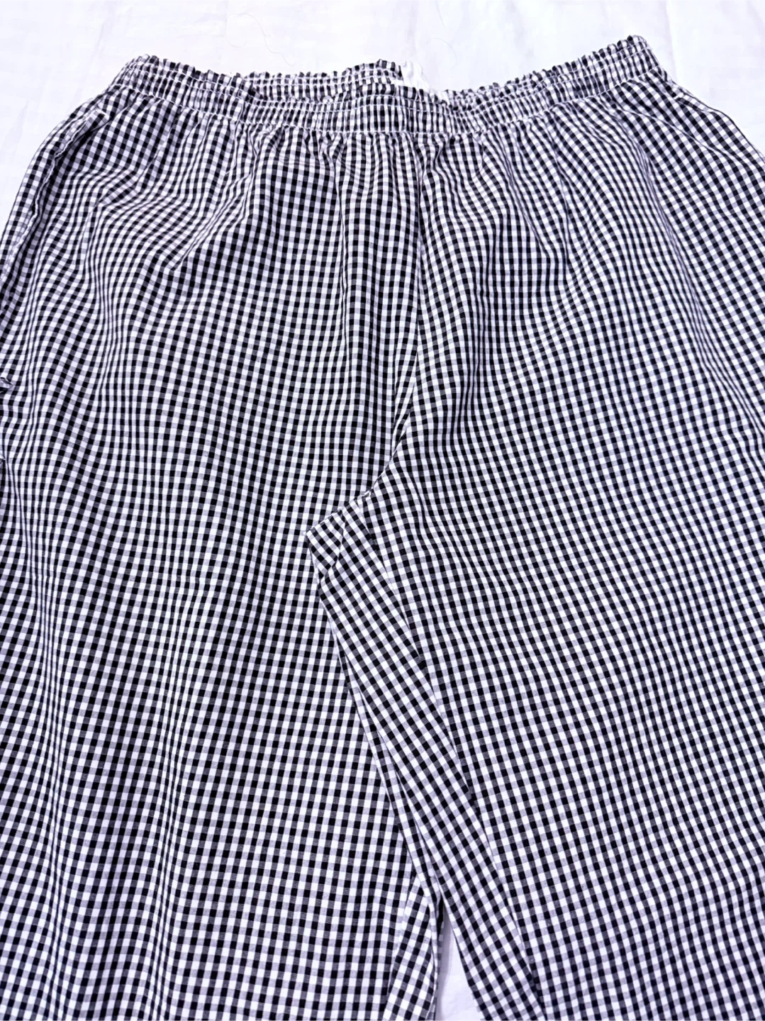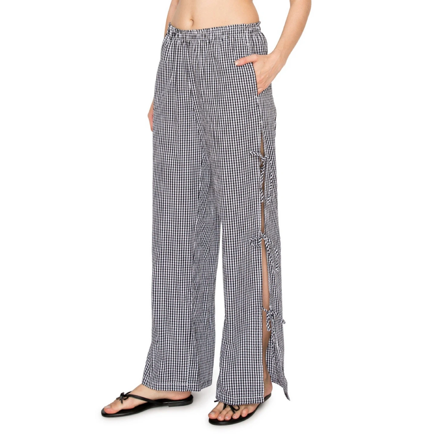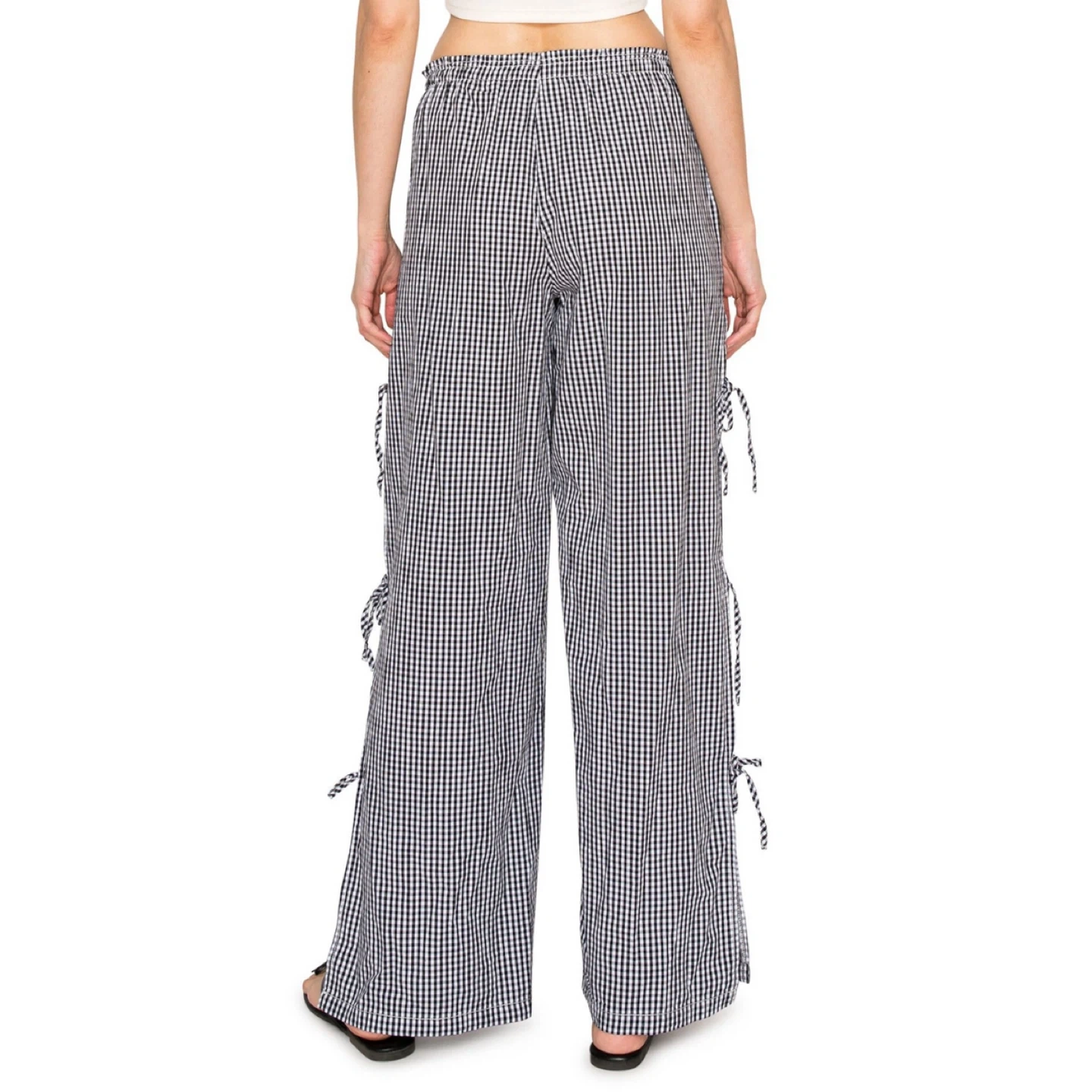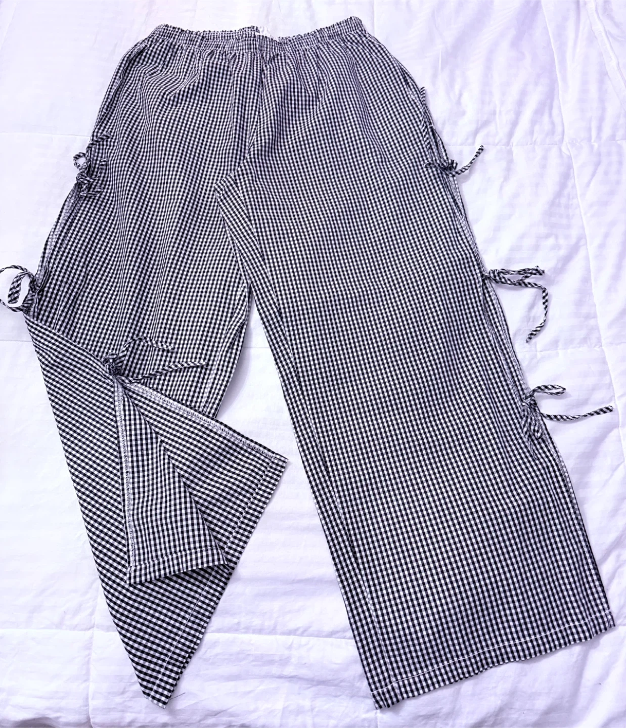 Cute Cali 1850 gingham pants with tie details on the sides! They're a size small and have a wide leg fit. The black and white pattern is super trendy and would be a great addition to your wardrobe.