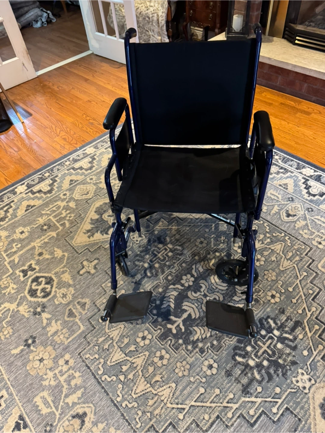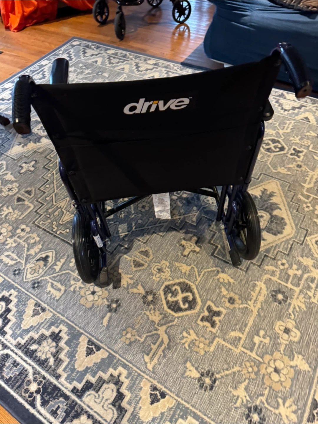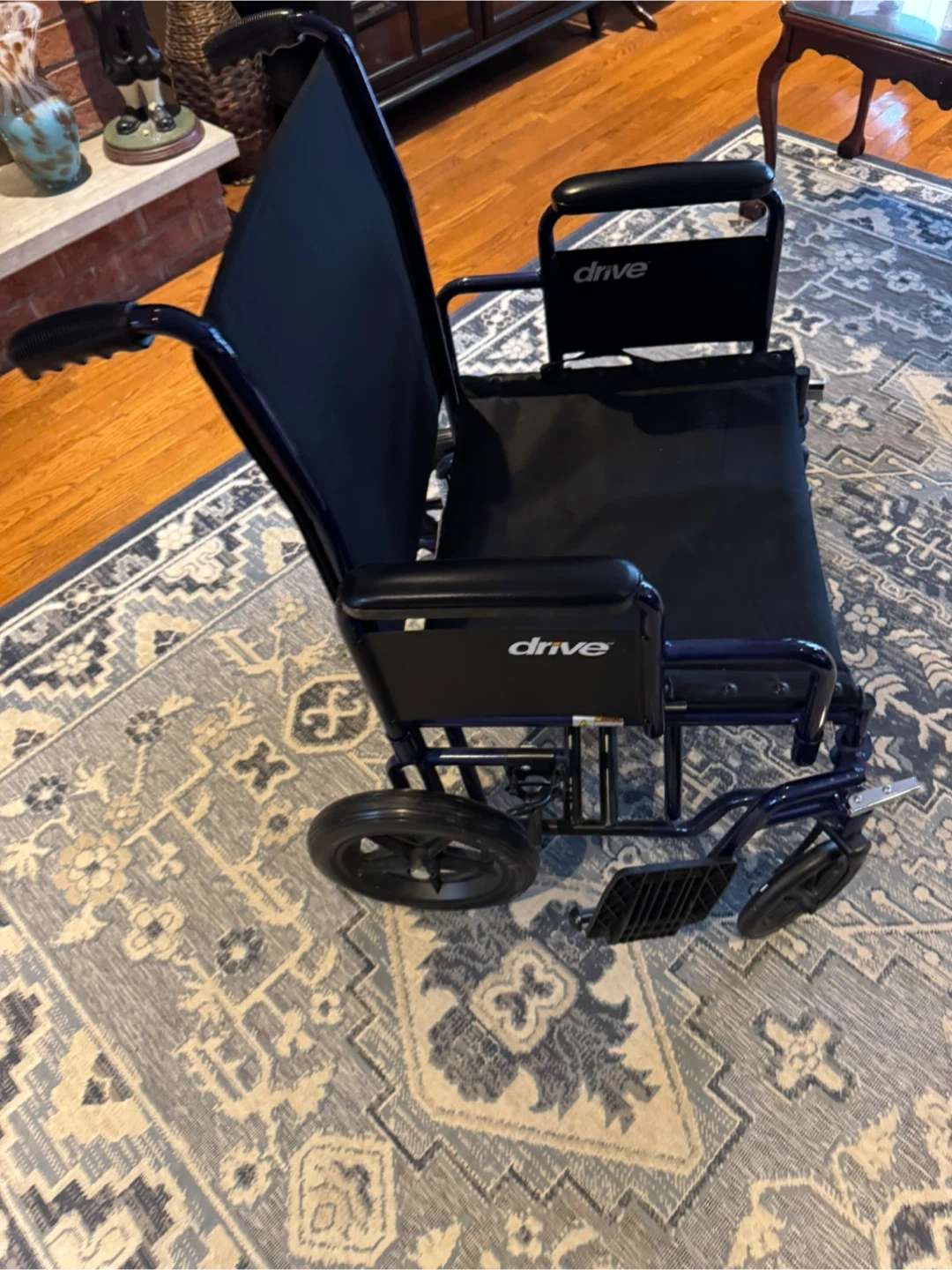 This is a Drive Medical folding wheelchair in blue. It's designed for easy transport and storage. The wheelchair has sturdy construction and comfortable seating.