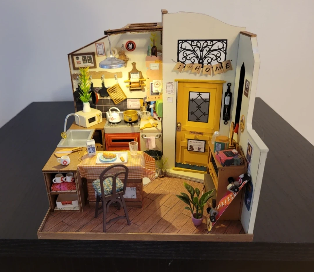 A charming DIY miniature dollhouse kit featuring a detailed kitchen scene. It includes various accessories like tiny appliances, furniture, and decor to build a cozy space. This kit is great for crafting enthusiasts and hobbyists who enjoy creating detailed models.