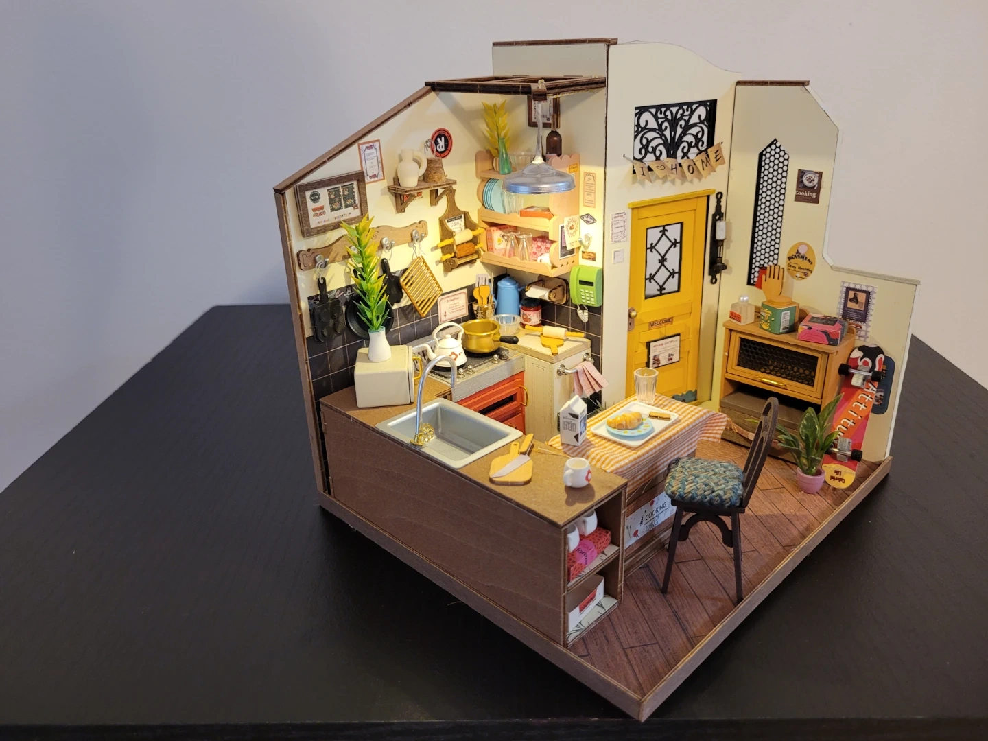 A charming DIY miniature dollhouse kit featuring a detailed kitchen scene. It includes various accessories like tiny appliances, furniture, and decor to build a cozy space. This kit is great for crafting enthusiasts and hobbyists who enjoy creating detailed models.