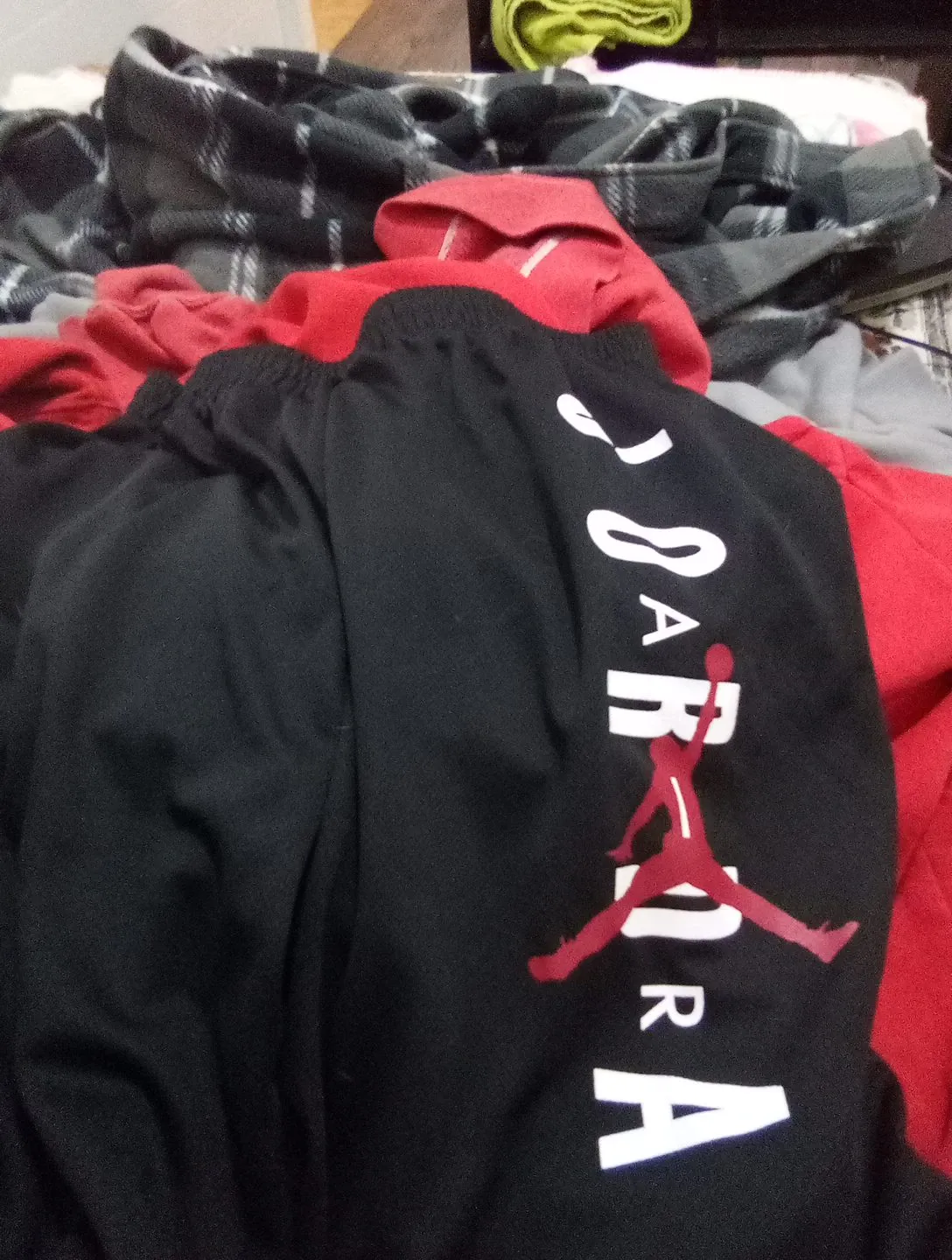 These are black Jordan joggers with red accents. They feature the Jumpman logo and Jordan lettering down the side. Made of a comfortable material, perfect for active wear or casual outings.