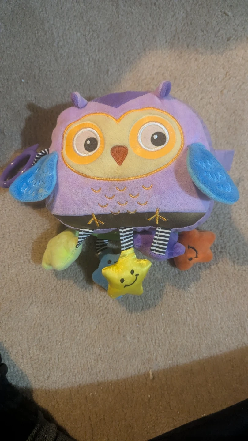 This adorable owl plush toy is perfect for a baby's crib or stroller! It features a cute owl design with hanging stars and soft, plush material. It's in great condition and ready to bring joy to a little one! Plays music when you push the middle.