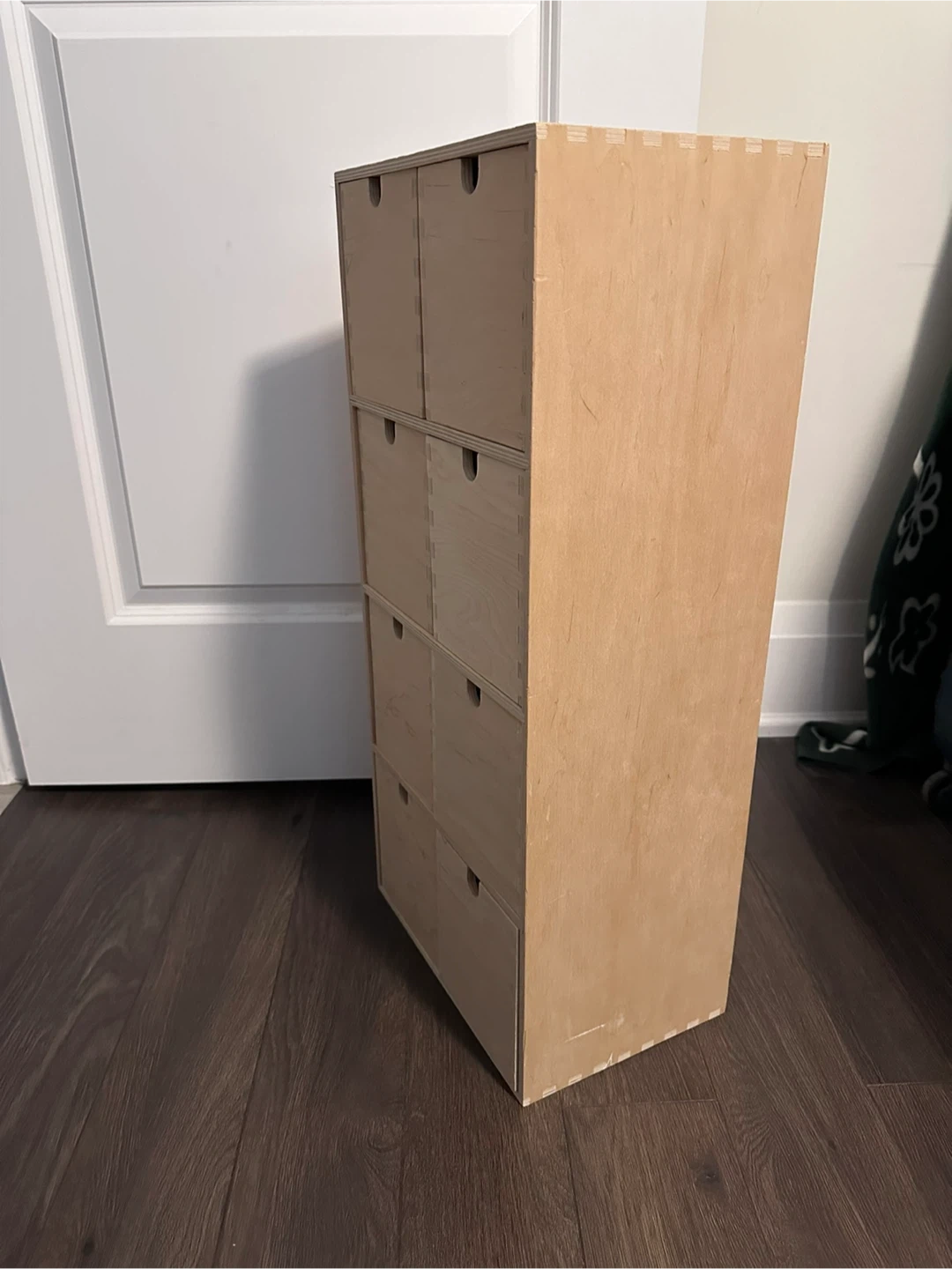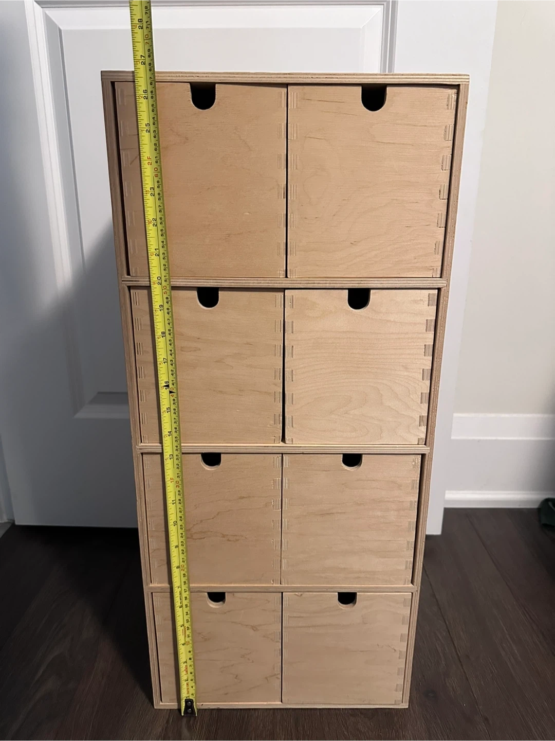 Excellent like new condition wooden storage unit with eight drawers. The unit is made of light-coloured wood. It's great for organizing small items. Size: 30.5 cm L x 29.5 cm D x 68 cm H. Each drawer size is 14.5 cm x 19 cm x 16 cm H.