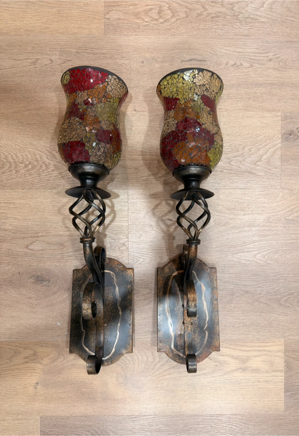 Beautiful pair of sconce wall lamps with mosaic glass shades. Each features a twisted metal stem and a decorative backplate. Adds a warm, ambient glow.