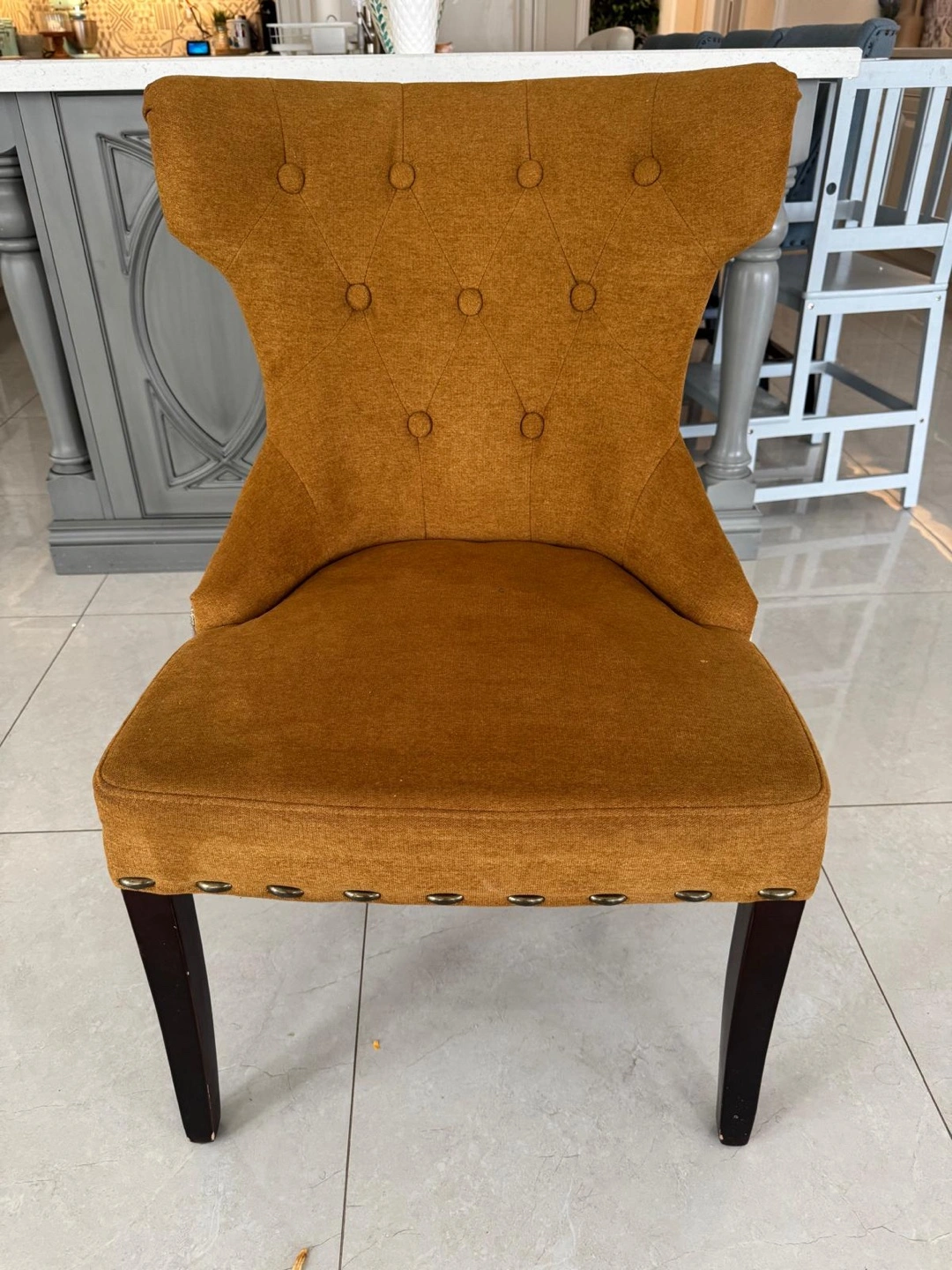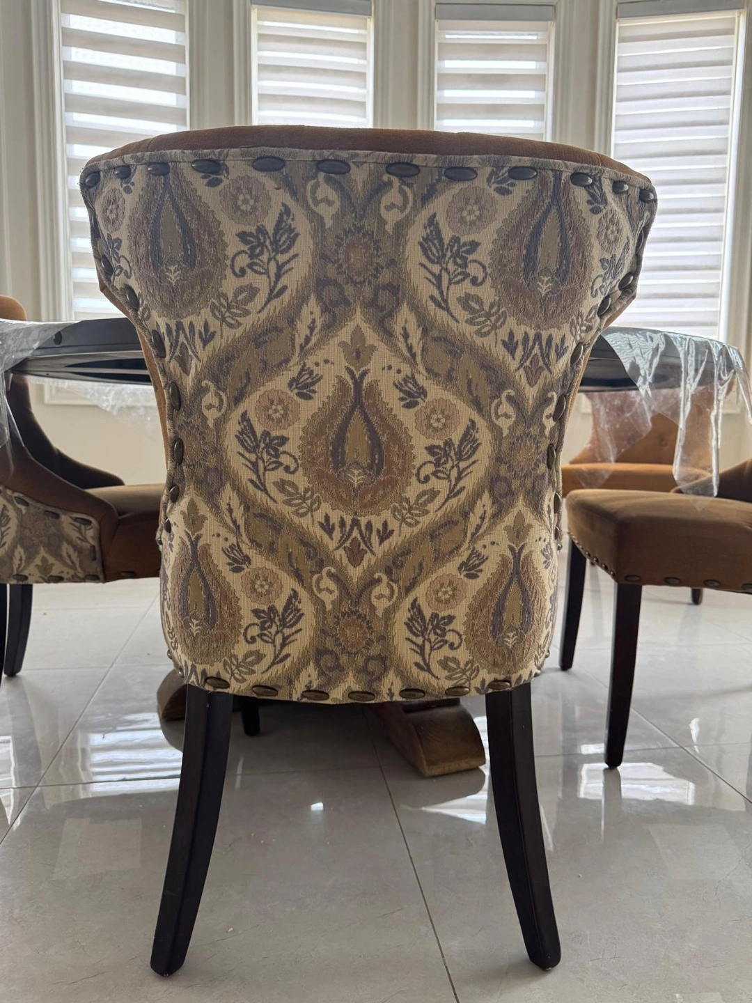 Beautiful upholstered dining chair. Dark brown legs. Button tufting on the back and seat. Intricate patterned fabric on the back. Stylish addition to any dining room or kitchen
