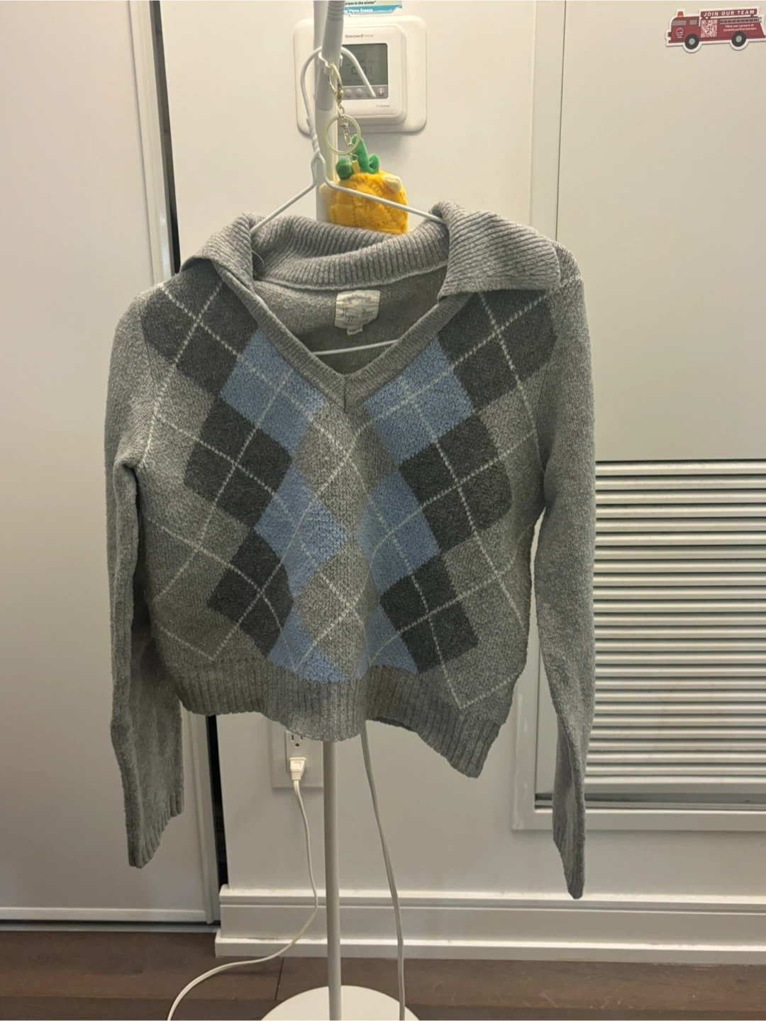 A cozy grey sweater featuring a classic argyle pattern in blue and grey. It's got a v-neck and a collared design. This knit top would be great for layering during cooler weather.