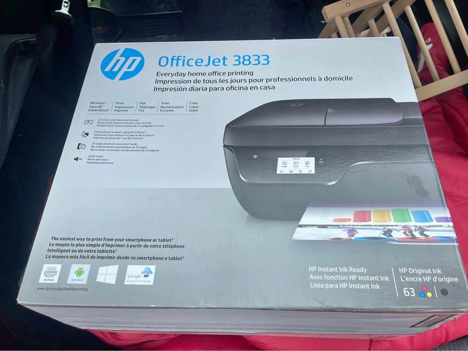 Selling my HP OfficeJet 3833 all-in-one inkjet printer. Works perfectly – prints, scans, copies, and faxes. Great for home or office use. Only selling because I upgraded and no longer need it.