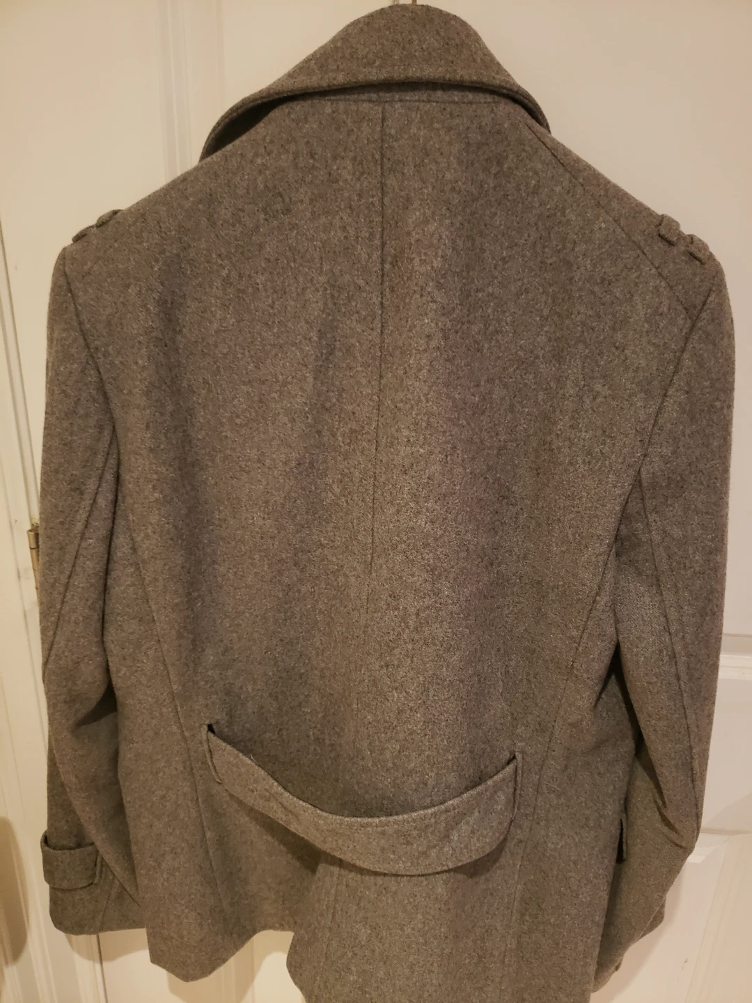Stylish grey double-breasted coat from H&M. It's made from a wool blend and features a classic pea coat design with button closures and epaulets. This coat is perfect for cooler weather, offering both warmth and a sharp look...only cash 💸