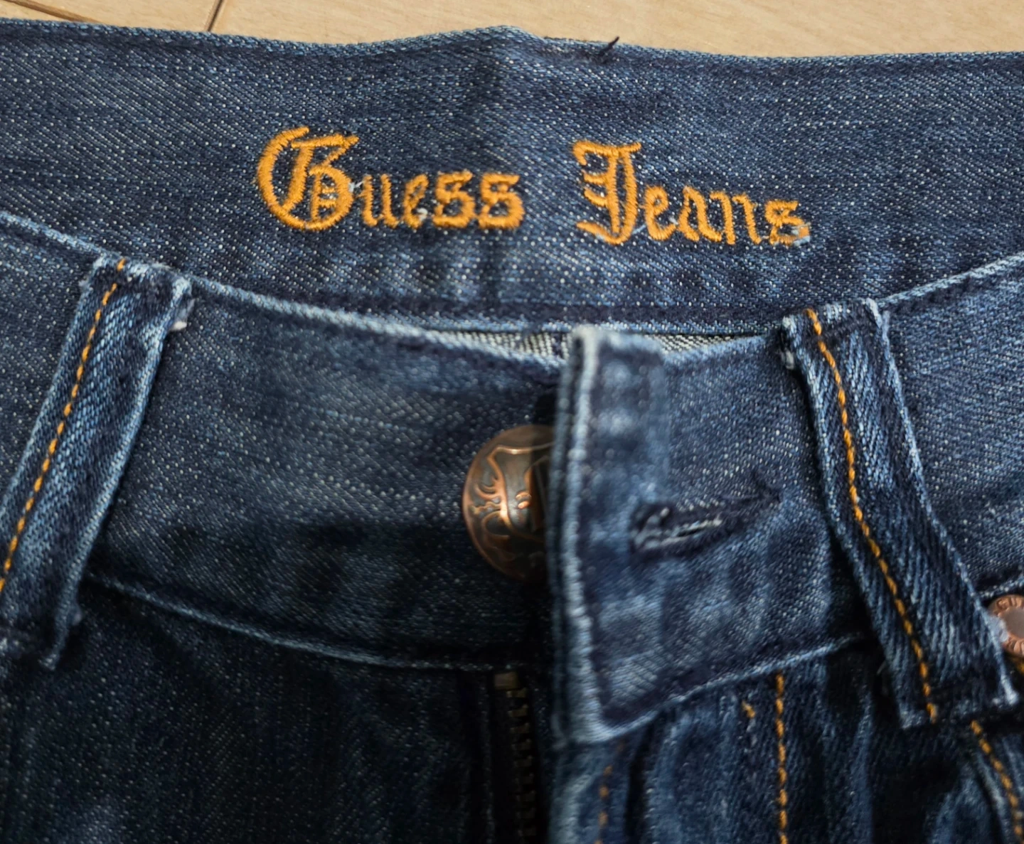 Selling a pair of authentic Guess Jeans in excellent condition. These feature a classic dark wash with stylish fading and a unique embroidered logo on the inner waistband. Made with 100% cotton for a sturdy, high-quality feel.