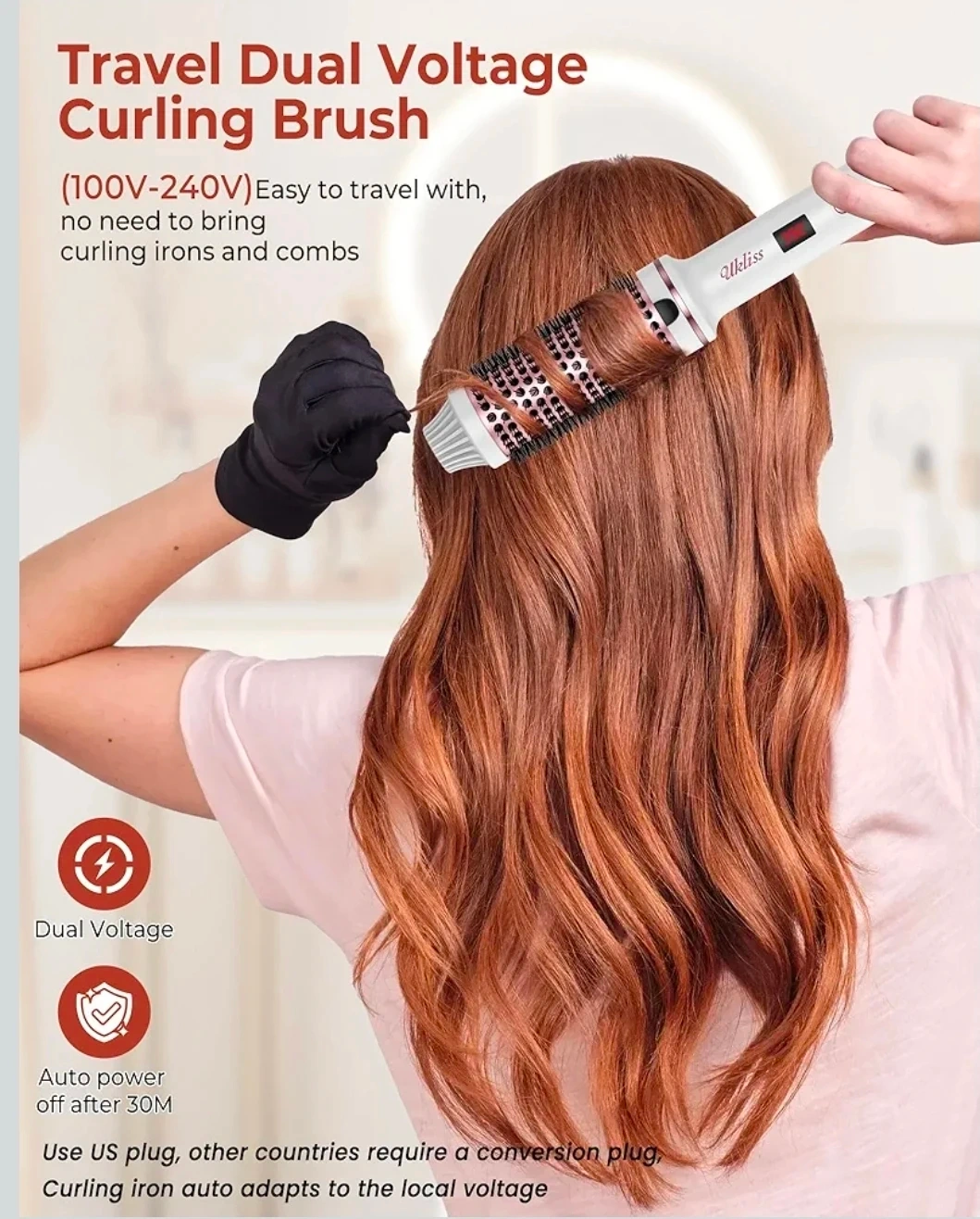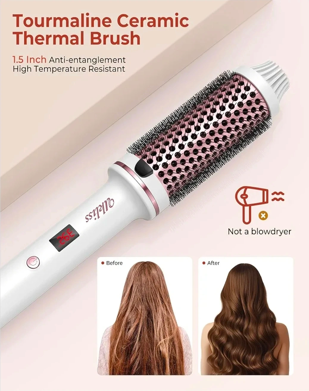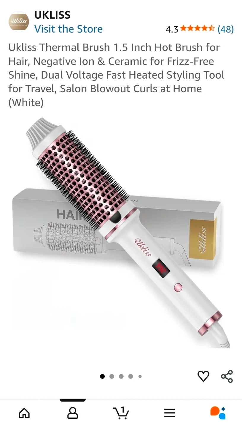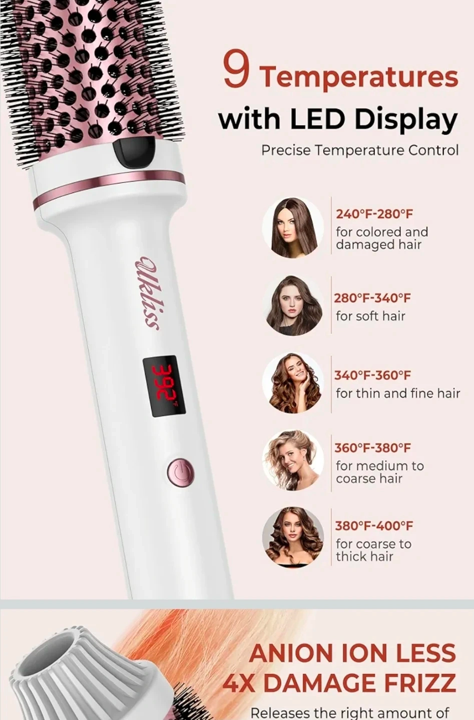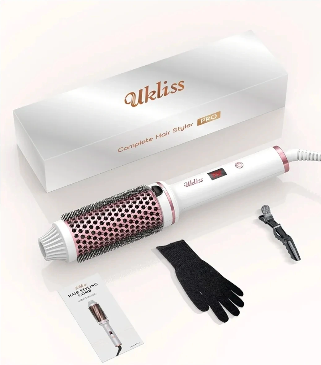This Ukliss thermal brush is 1.5 inches and comes in white. It features dual voltage and 9 temperature settings with an LED display for precise temperature control. Auto power shuts off after 30 minutes. It uses negative ions to reduce frizz and leave hair shiny.