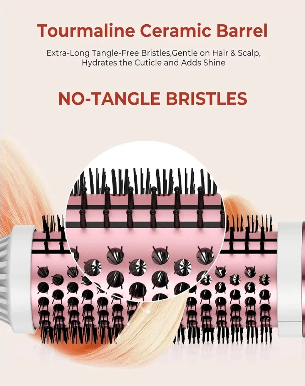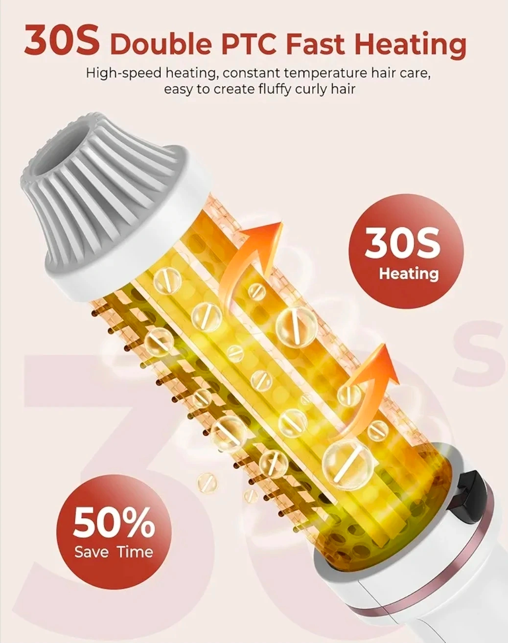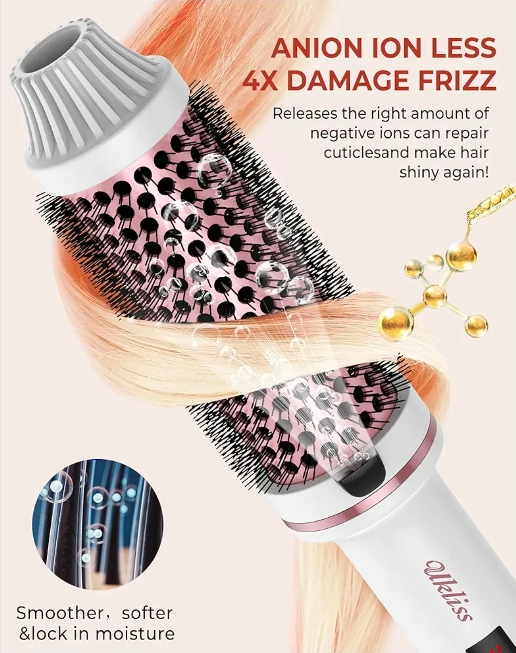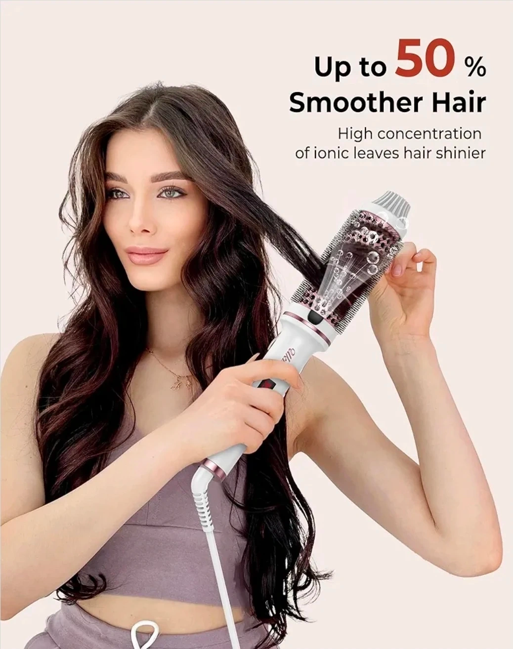 This Ukliss thermal brush is 1.5 inches and comes in white. It features dual voltage and 9 temperature settings with an LED display for precise temperature control. Auto power shuts off after 30 minutes. It uses negative ions to reduce frizz and leave hair shiny.