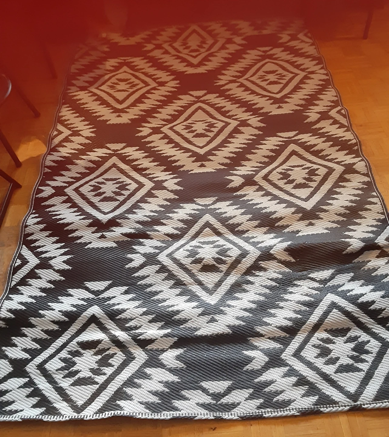 A dark grey and white patterned area rug. It has a geometric diamond design. This rug is great for adding a decorative touch to any room. It is reversible and can be an added touch to your patio.