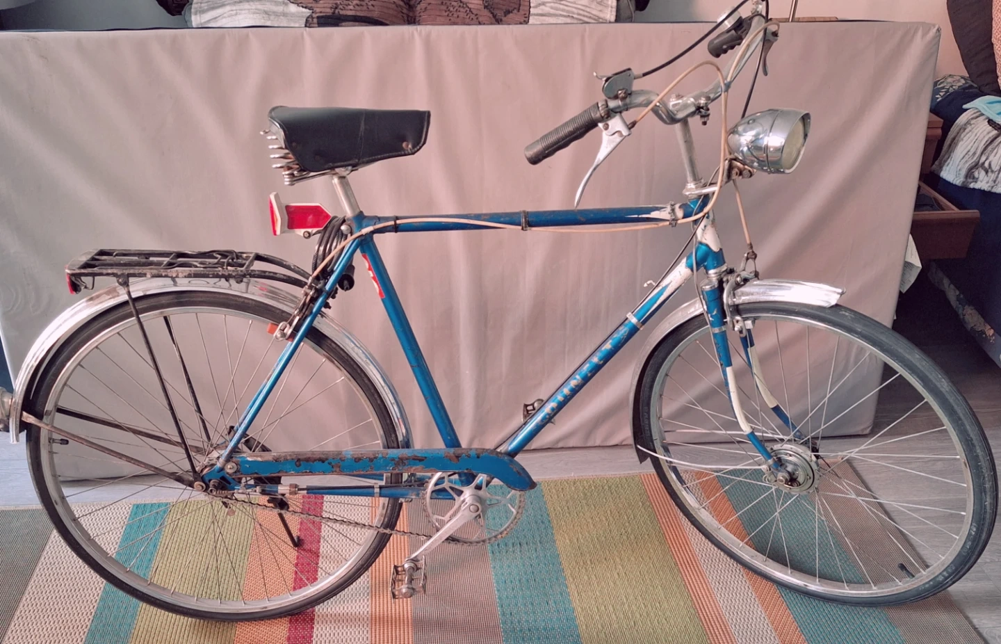 Vintage 60s English made, blue Dunelt bicycle with a 3 speed Sturmey Archer gear shifter. Features working hub magneto light, French Lyotard pedals, rear rack and a kickstand. This bike is great for commuting or casual rides.
