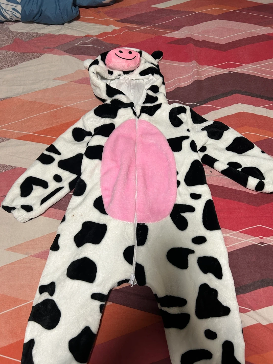 Selling a cute cow print onesie! It's white with black spots and has a pink belly and a hood with a smiling cow face. Perfect for lounging around the house or a fun costume!
