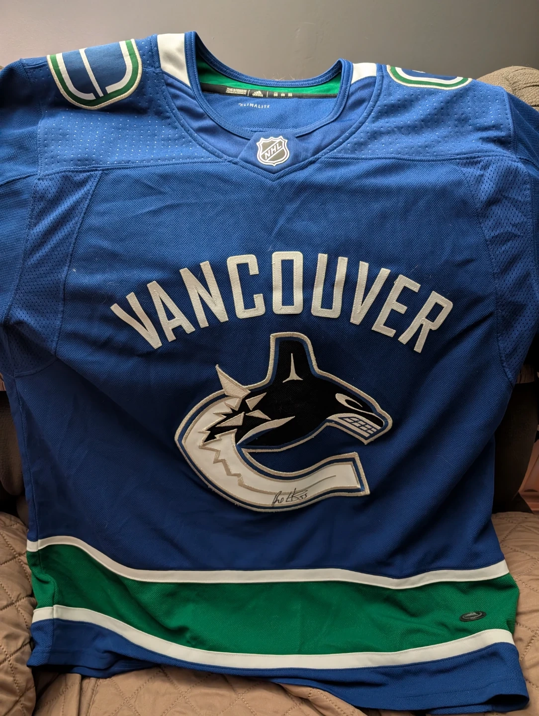 This is an Adidas Vancouver Canucks hockey jersey. It's made with Climalite fabric for breathability. Features the iconic Orca logo and NHL crest. Size is 56. Never been worn. Has Bo Horvat authentic signature. Came from Canucks, and was signed by Bo at a season ticket holder event. $100